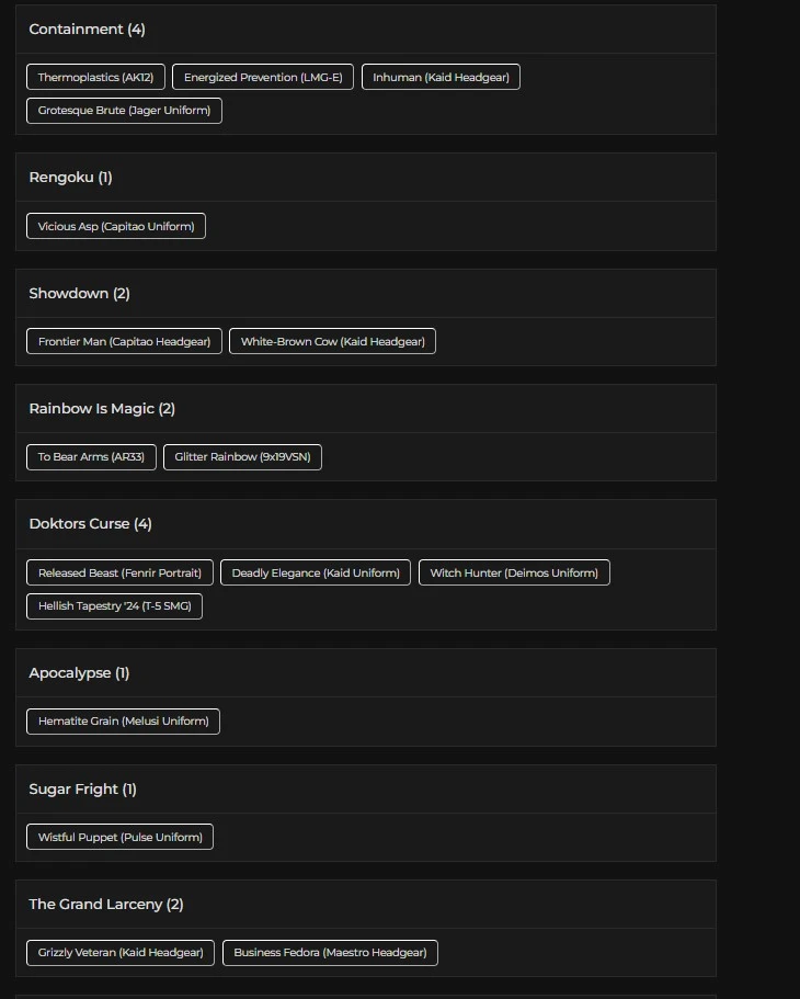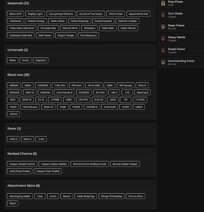 138 LVL ⸱ 38X BLACK ICES ⸱ 22X SEASONALS ⸱ 3X RACER ⸱ 3X UNIVERSALS ⸱ 59 OPERATORS ⸱ 3K RENOWN ⸱ FA