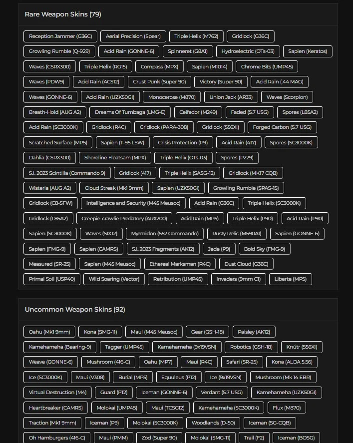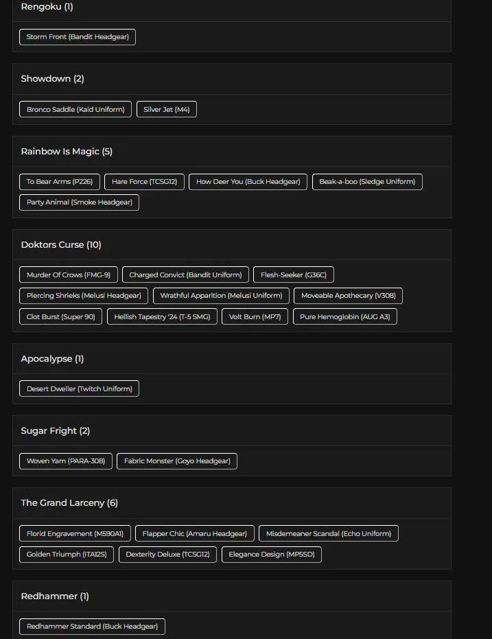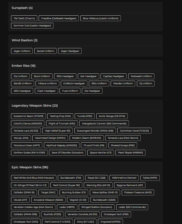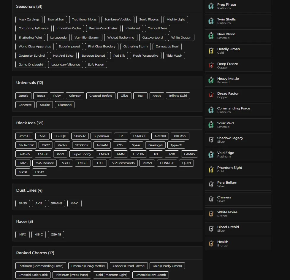 268 LVL ⸱ 39X BLACK ICES ⸱ 31X SEASONALS ⸱ 12X UNIVERSALS ⸱ 4X ELITES ⸱ 74 OPERATORS ⸱ 4K RENOWN ⸱ FA