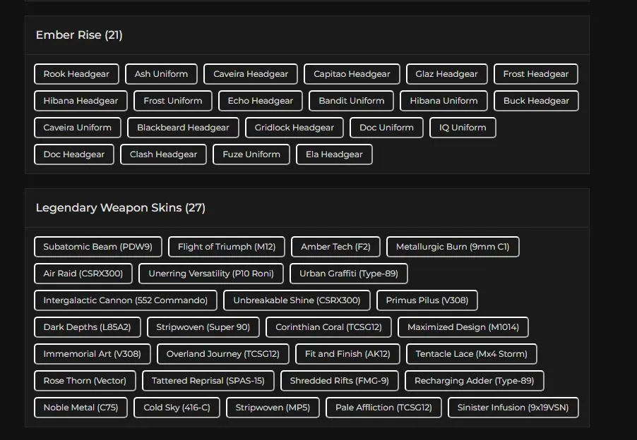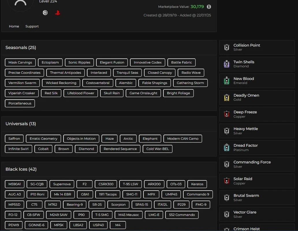【PC/XBOX】414 Skins | 42 Black Ice | 25 Seasonals | 6 ProLeague | 13 Universals | 5 Elites | 224 LVL