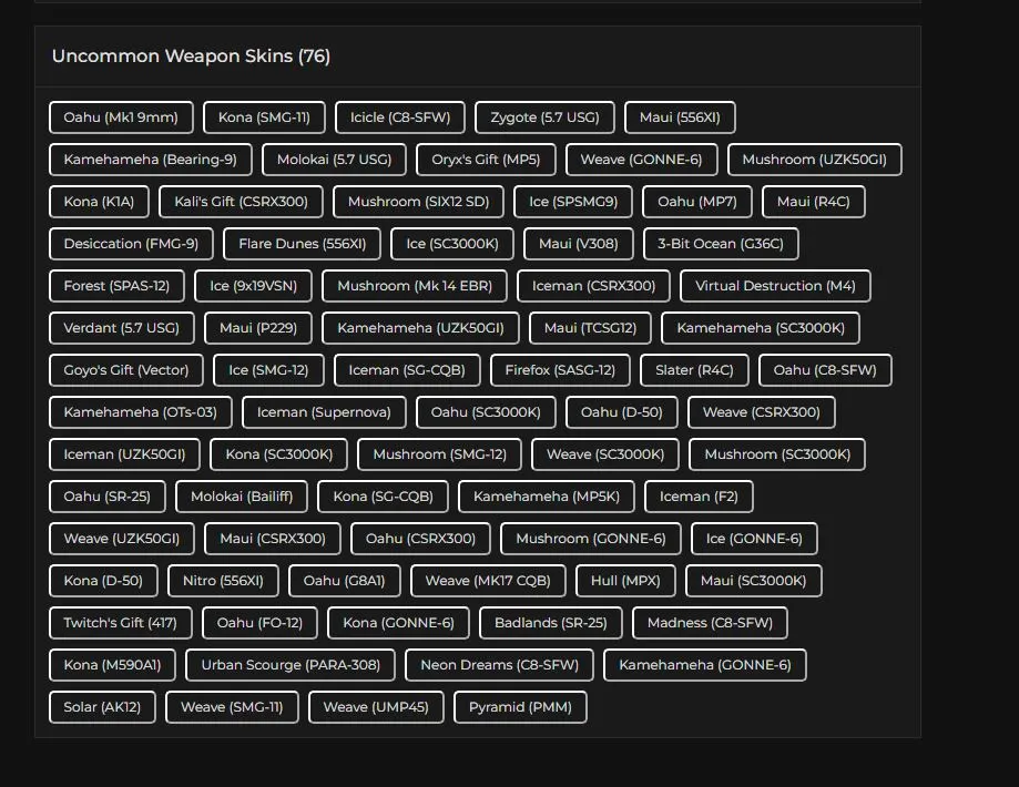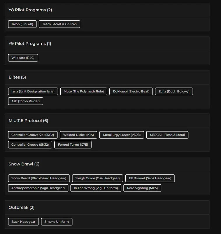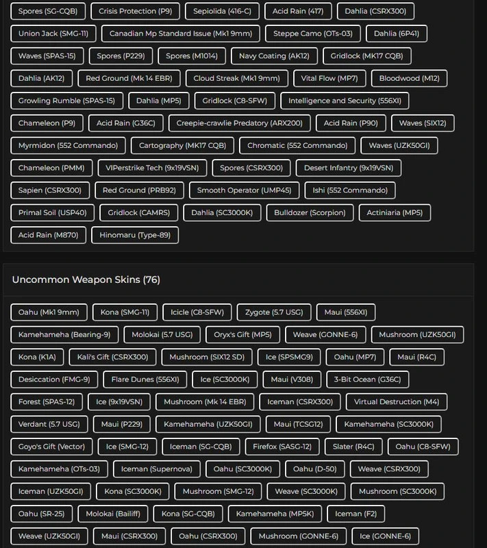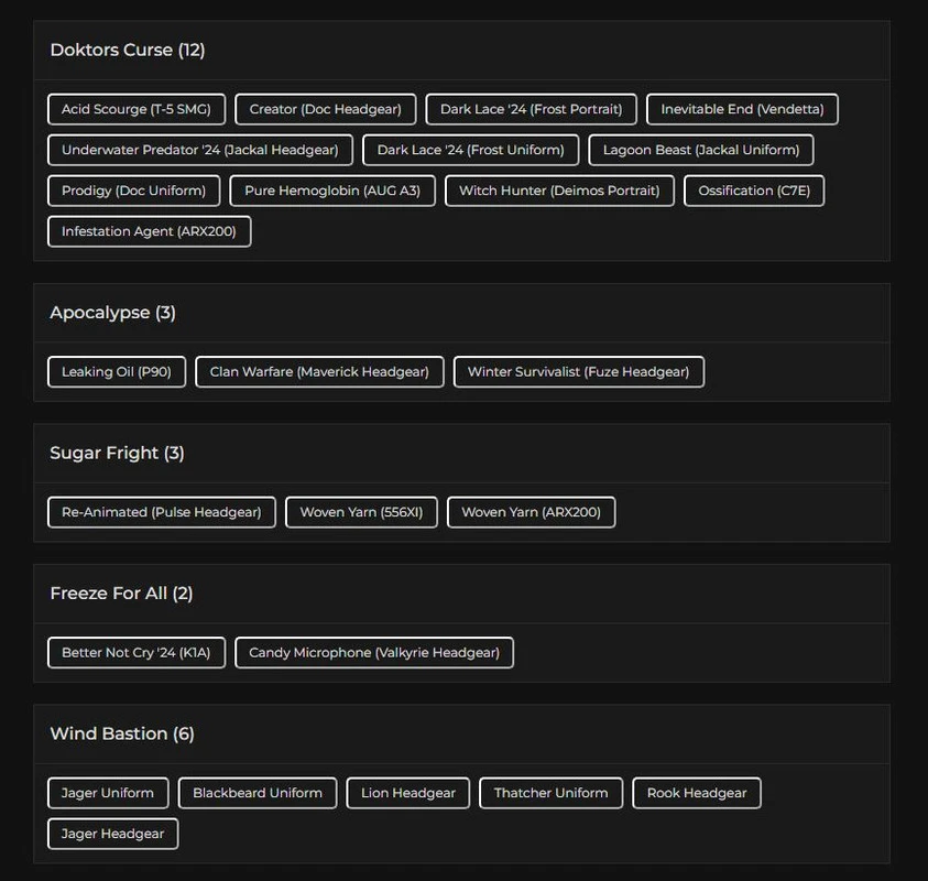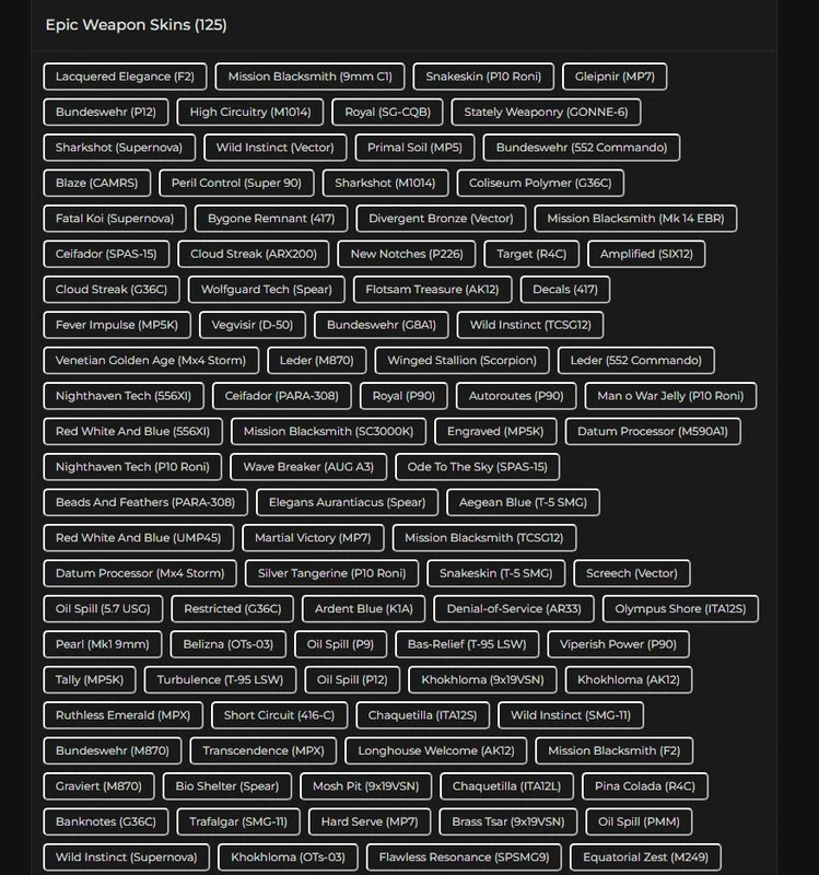 【PC/XBOX】414 Skins | 42 Black Ice | 25 Seasonals | 6 ProLeague | 13 Universals | 5 Elites | 224 LVL