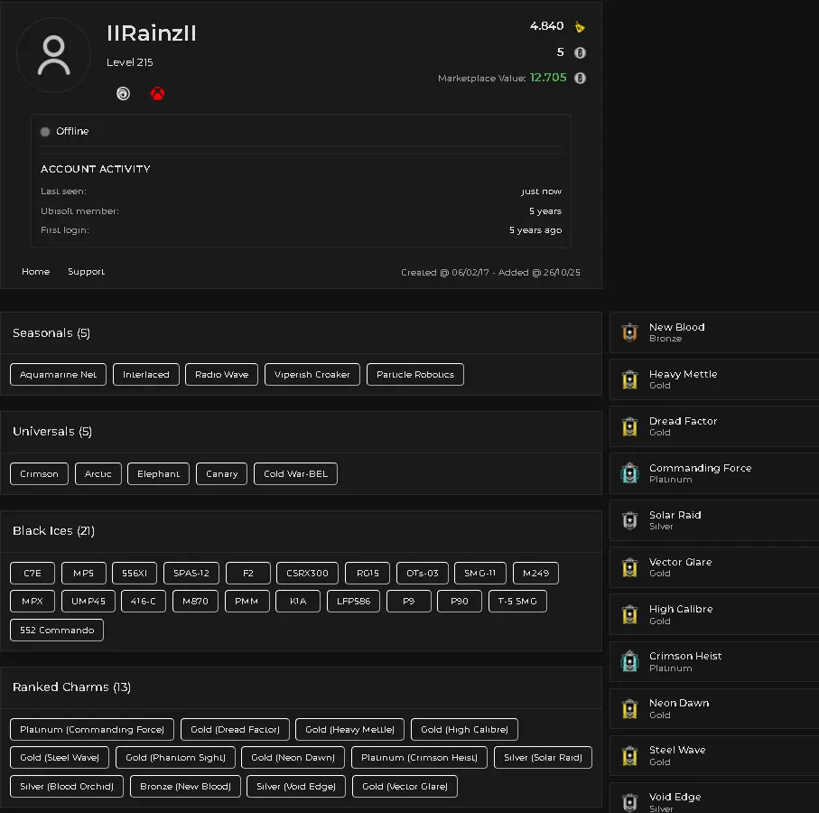 ⭐[PSN LINKABLE]⭐Level 215✨X2 Platinum🎨5 Universal Skin🌸5 Seasonals Skin❄️21 Black Ice👑69 Operators🔥166 Weapon Skin⚜️2 Elite💫