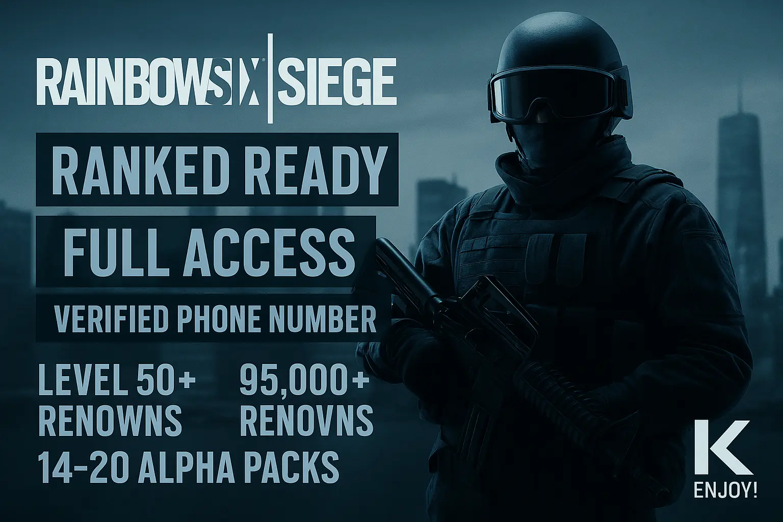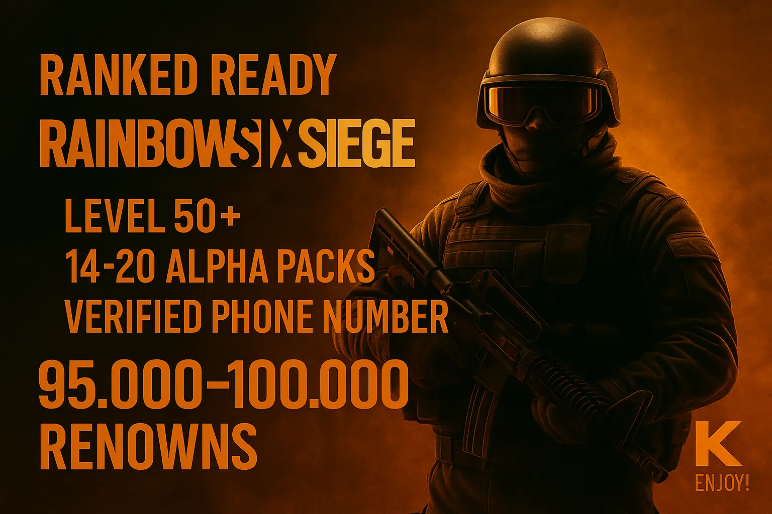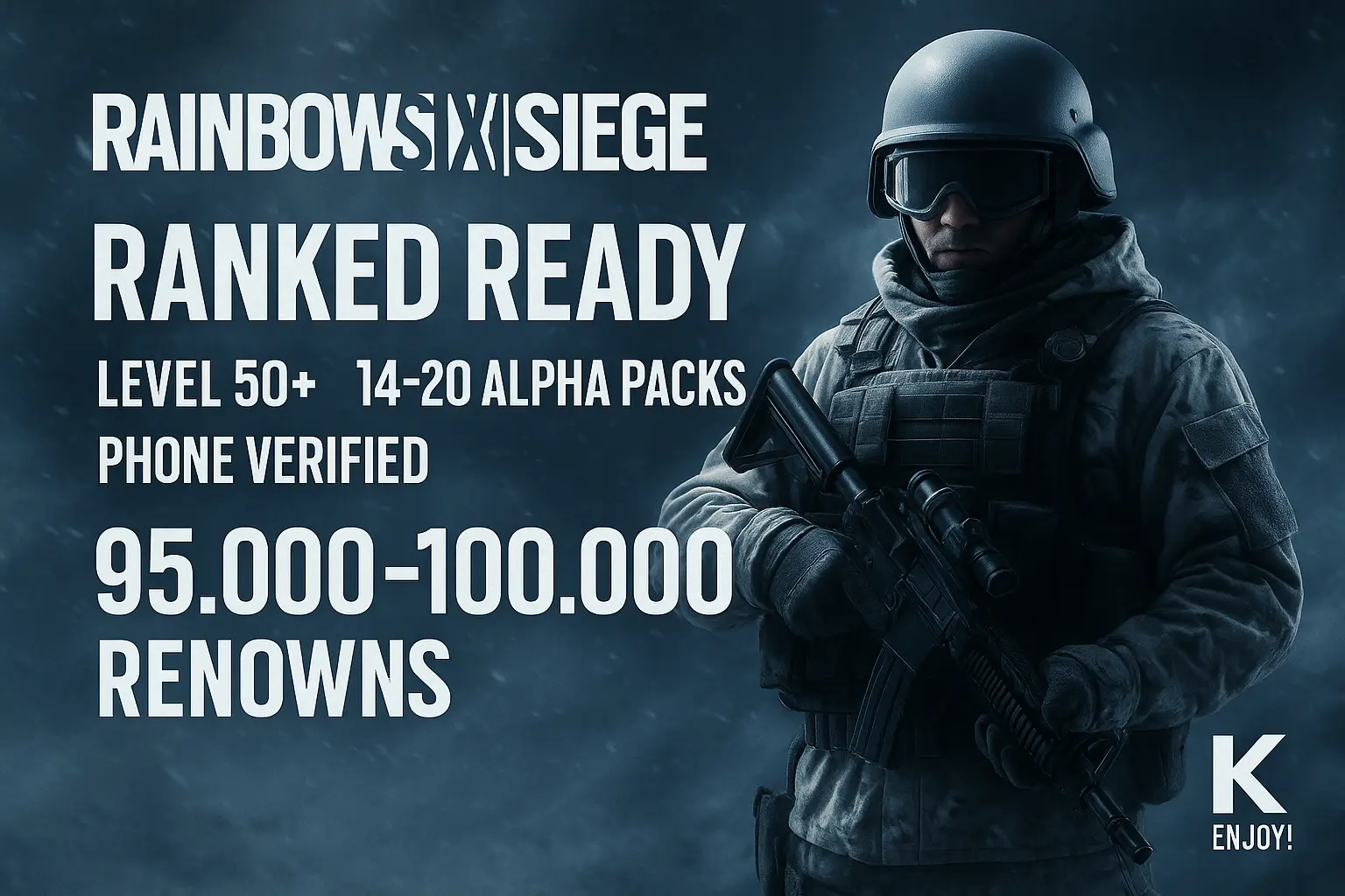 🪀 Ranked Ready 📑 Level 50 🧊 Smurf R6S Account 💫 95.462 RENOWNS 🛒 12–40 Alpha Packs 🪫 1–2x Beginner Packs 🧩 Configurable Details · Steam #J1F4L