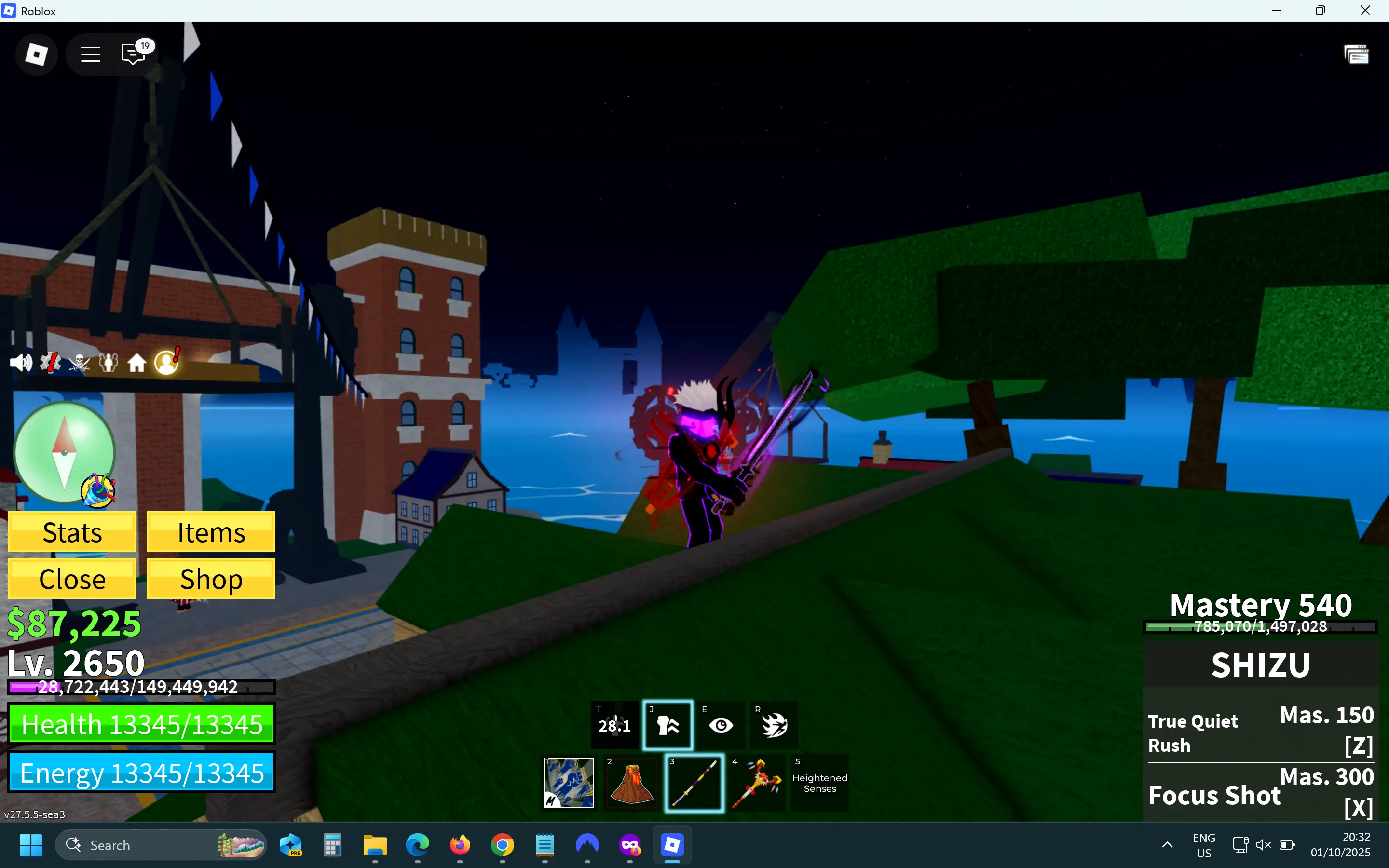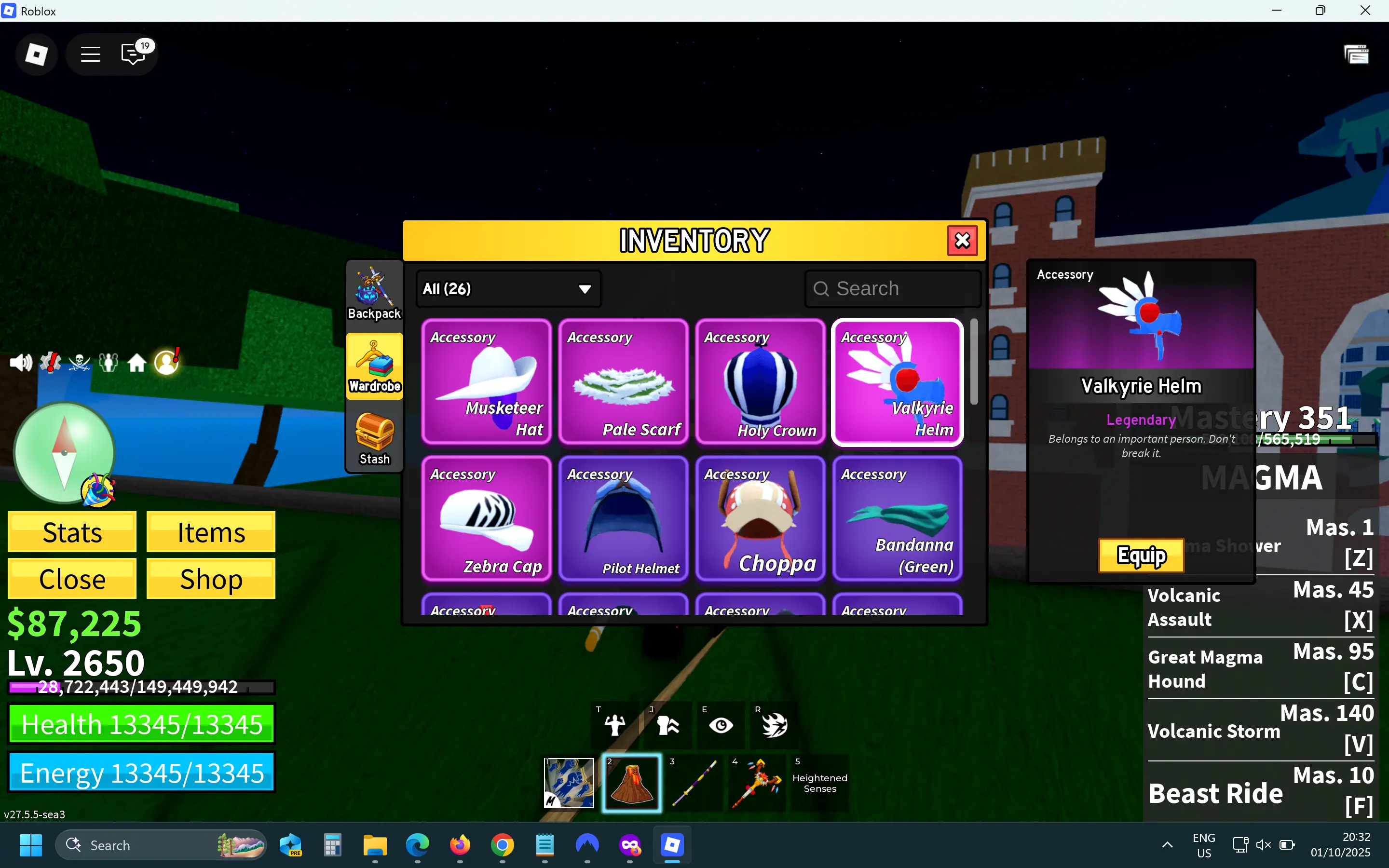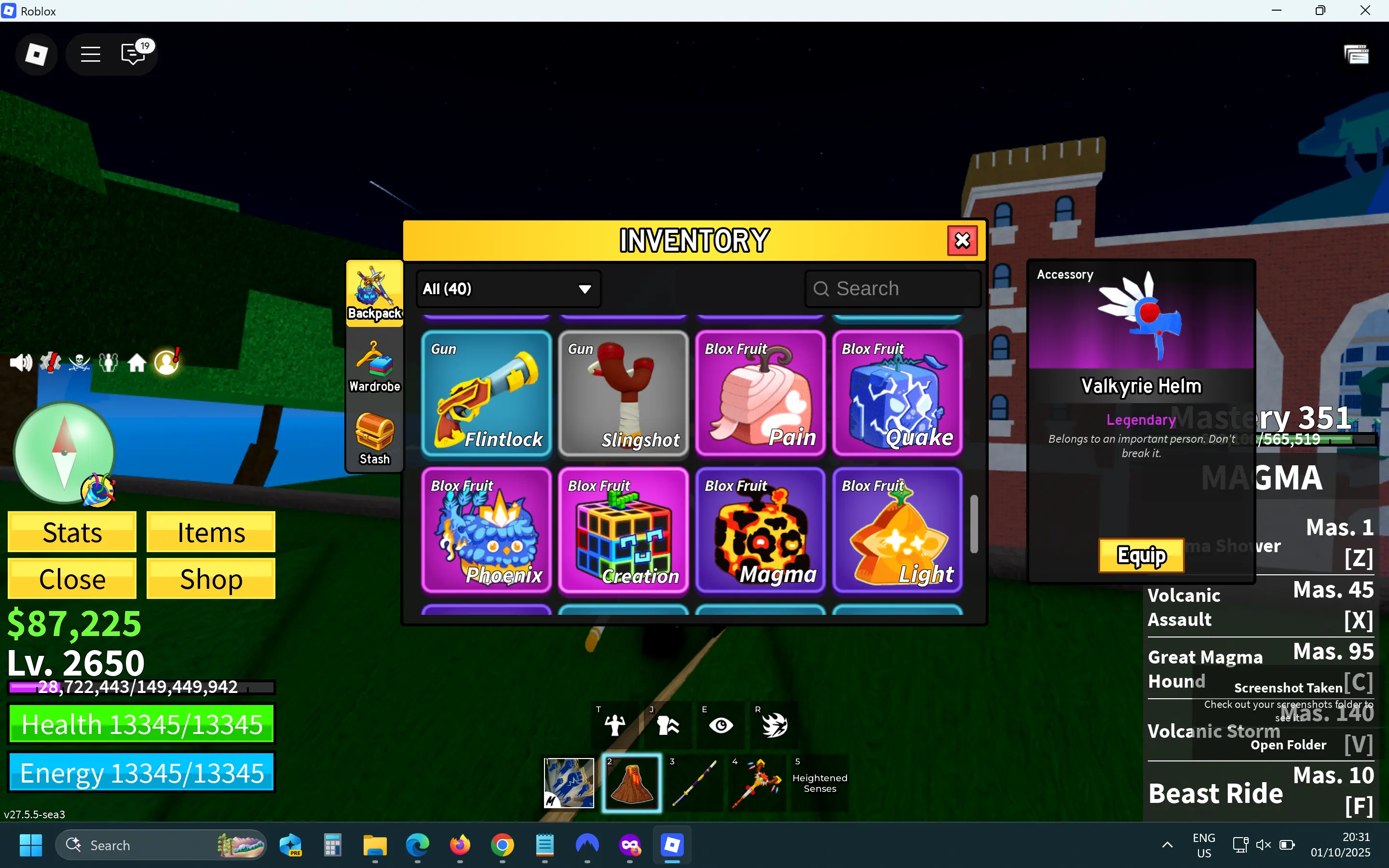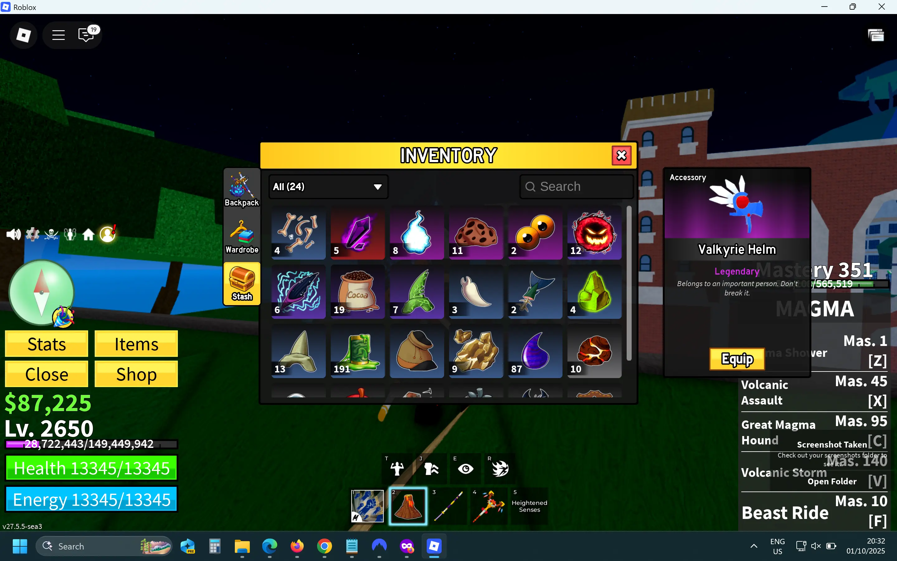 [Instant] Level 2650 / Godhuman / Valkyrie Helm, Pale Scarf, Pole, Shizu, Kabucha, Acidum Rifle / INV: Pain, Quake, Phoenix / Dark Fragment / V3 Race ⸱ Blox Fruit | Avatar (Gojo): White Spikey Sorcerer Hair