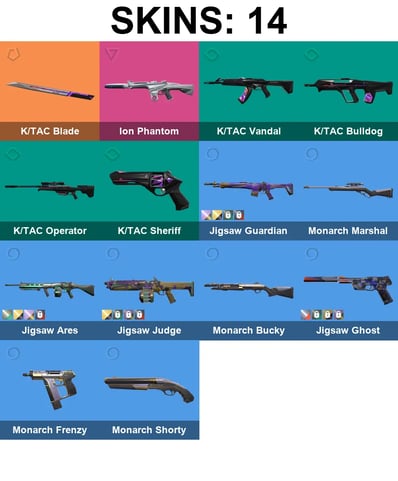 ASIA/SEA/OCE | 14 Skins + 1 Knife | K/TAC Blade | Ion Phantom | K/TAC Vandal | K/TAC Bulldog | K/TAC Operator | K/TAC Sheriff | Jigsaw Guardian | Monarch Marshal | Jigsaw Ares | Jigsaw Judge | Monarch Bucky | 6x Bronze Buddy + 2x Silver Buddy