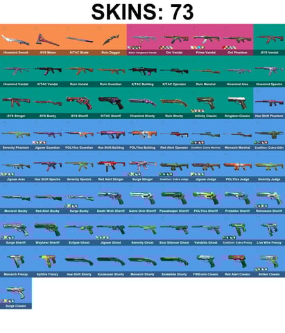 ASIA/SEA/OCE | 73 Skins + 4 Knives | Hivemind Sword | .SYS Melee | K/TAC Blade | Ruin Dagger | Gaia's Vengeance Vandal | Oni Vandal | Prime Vandal | Oni Phantom | .SYS Vandal | Hivemind Vandal | K/TAC Vandal | 10x Platinum Buddy + 6x Diamond Buddy