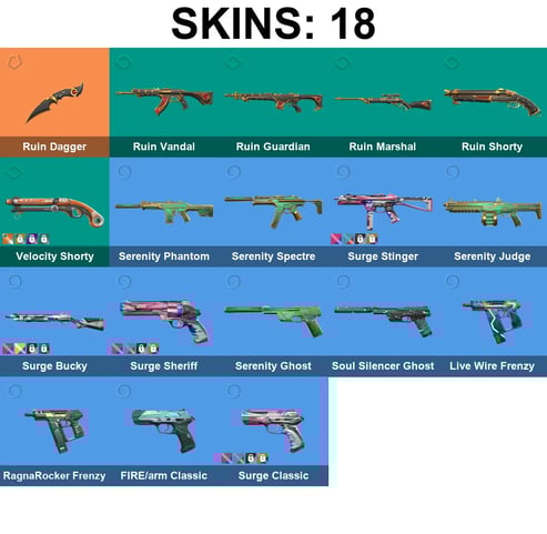 ASIA/SEA/OCE | 18 Skins + 1 Knife | Ruin Dagger | Ruin Vandal | Ruin Guardian | Ruin Marshal | Ruin Shorty | Velocity Shorty | Serenity Phantom | Serenity Spectre | Surge Stinger | Serenity Judge | Surge Bucky | 6x Platinum Buddy + 2x Ascendant Buddy