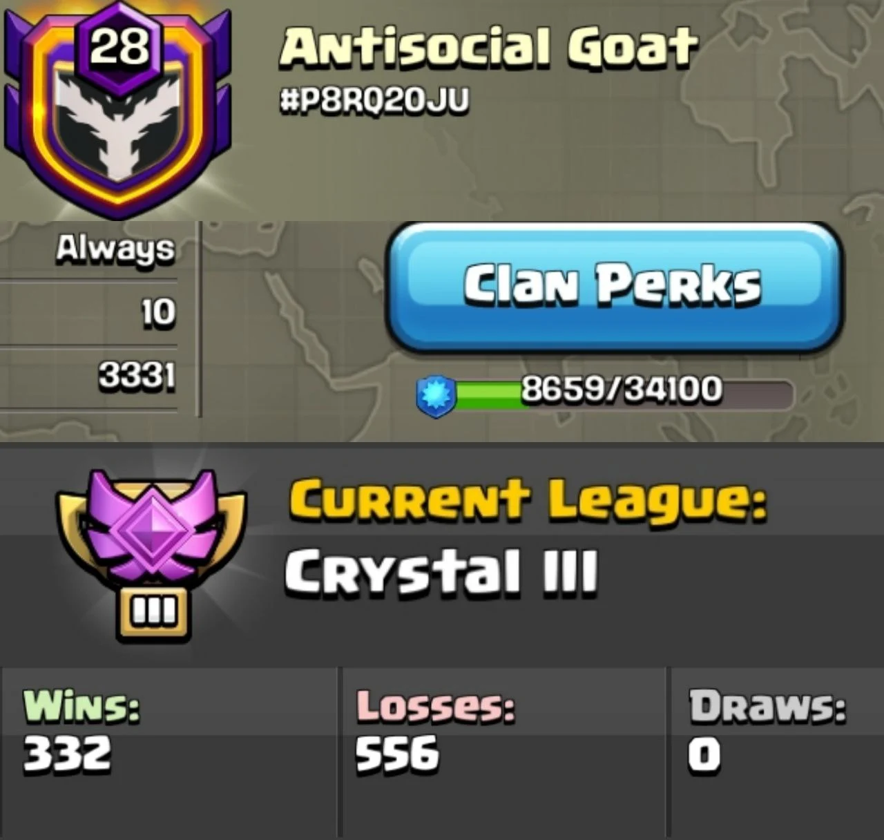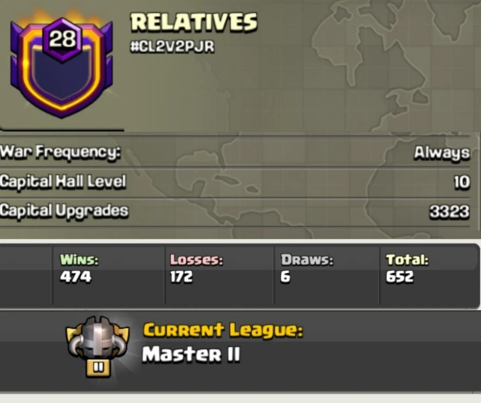 0p NAME: RELATIVES 🏆 LEVEL: 28 💎 CAPITAL HALL: 10 ⚡ WAR LOG: 474-172 🌹 CWL LEAGUE: MASTER II