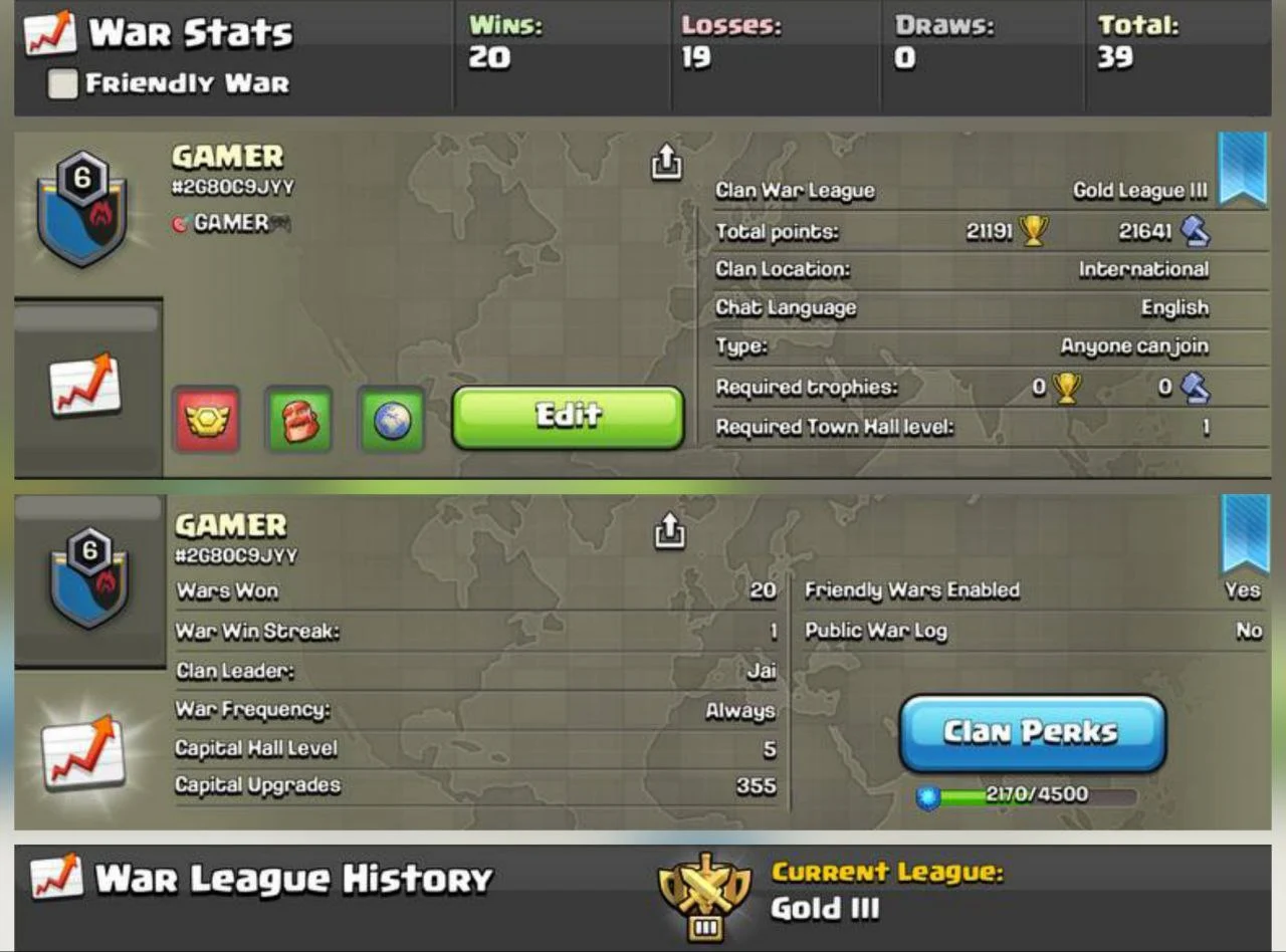 [CJ]💥 CLAN LEVEL 6 | 🎯CLAN NAME: GAMER | 🏰 CAPITAL HALL 5 | 🏆 CLAN LEAGUE: GOLD III | 📜 WARLOG: 20✅ - 19❌