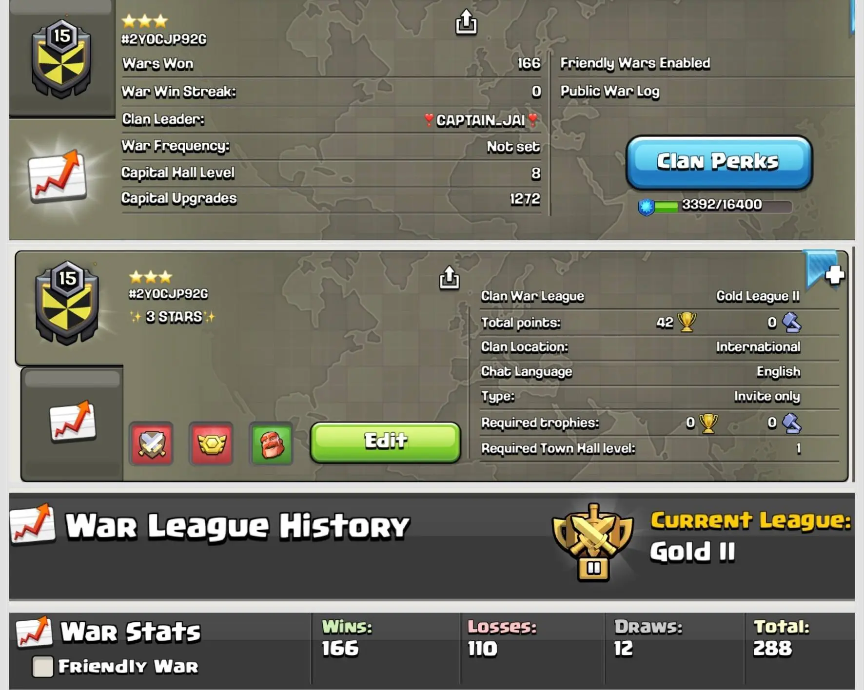 [CJ]🔥 LVL 15 CLAN ⚡ GOLD II 🥇 | CH8 🏛️ | WAR DOMINANCE 166W ⚔️