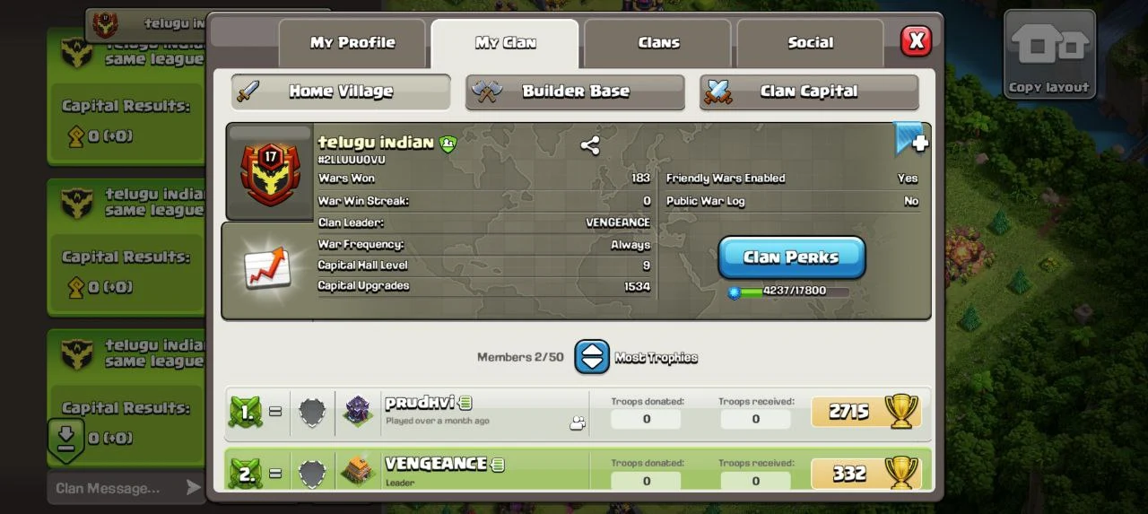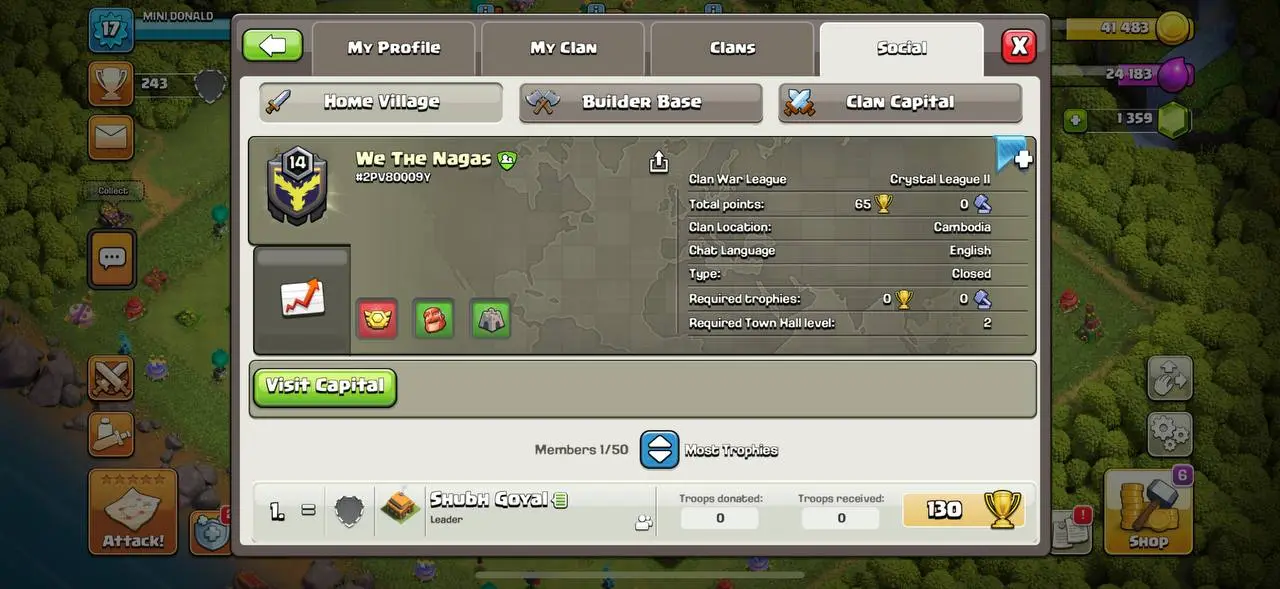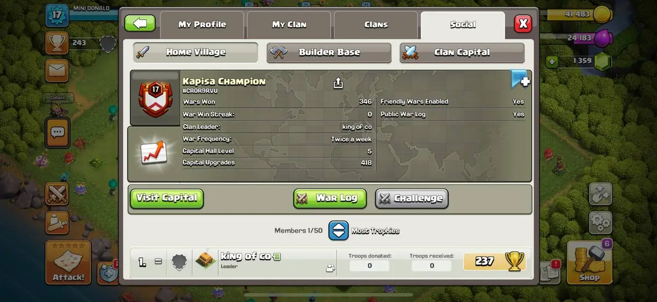 0p LEVEL 17 [] CLAN NAME: KAPISA CHAMPION [] CAPITAL HALL: 5 [] WAR WON: 346 [] CWL: CRYSTAL 3