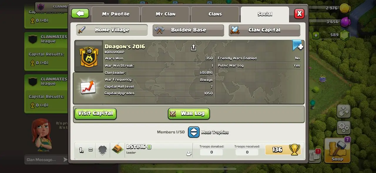 0p LEVEL 19 [] CLAN NAME: DRAGON 2016 [] CAPITAL HALL: 7 [] WAR WON: 350 [] CWL: CRYSTAL 2