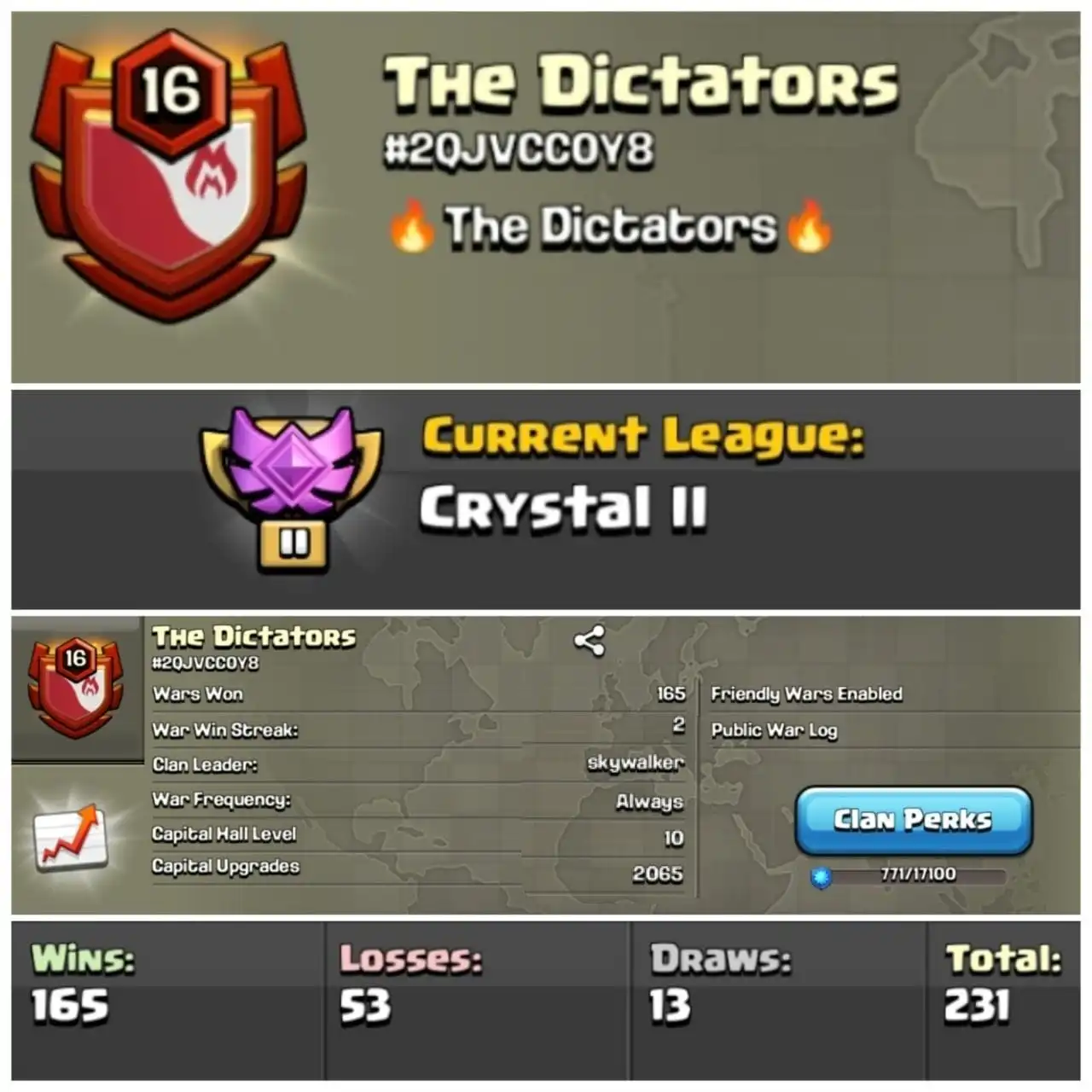Good level 16 clan || clan capital 10 || crystal 2 || warlog 165-53 || name - The Dictators