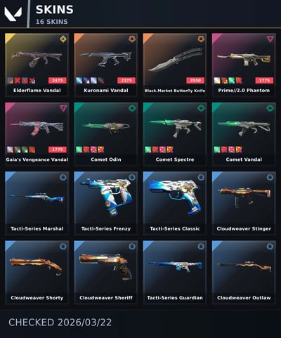 🍓 [Europe] ⸱ 16 Skins 💫 Elderflame Vandal 💫 Kuronami Vandal 💫 Black.Market Butterfly Knife 💫 Prime//2.0 Phantom 💫 Gaia's Vengeance Vandal