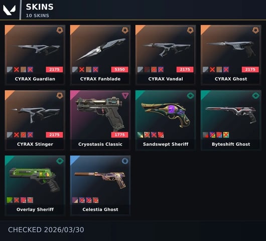 ⛈ [Europe] ⸱ 10 Skins ☀️ CYRAX Fanblade 🌧 CYRAX Vandal ⚡️ CYRAX Stinger 💦 CYRAX Ghost ☁️ CYRAX Guardian