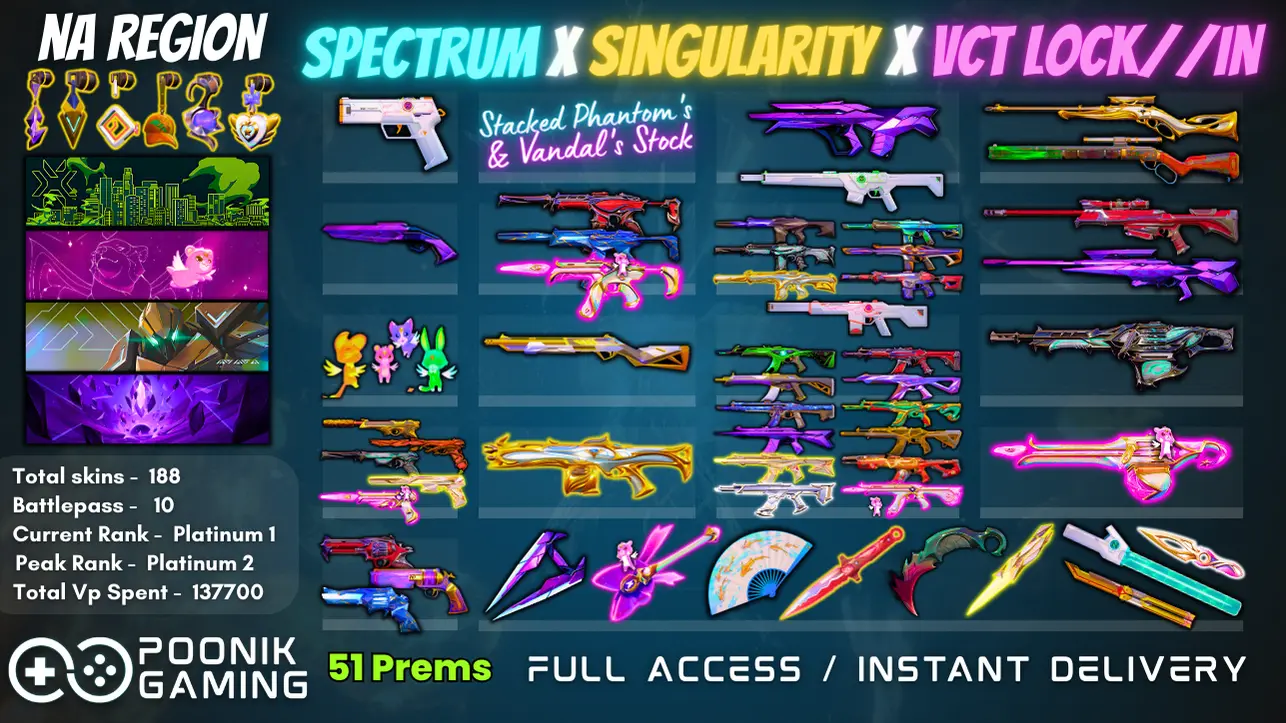 188 SKINS ⸱ NA REGION | VCT KNIFE, EVORI & MYSTBLOOM BUNDLE, KURONAMI, SINGULARITY, 10 BATTLEPASSES & MORE! [VNA219]