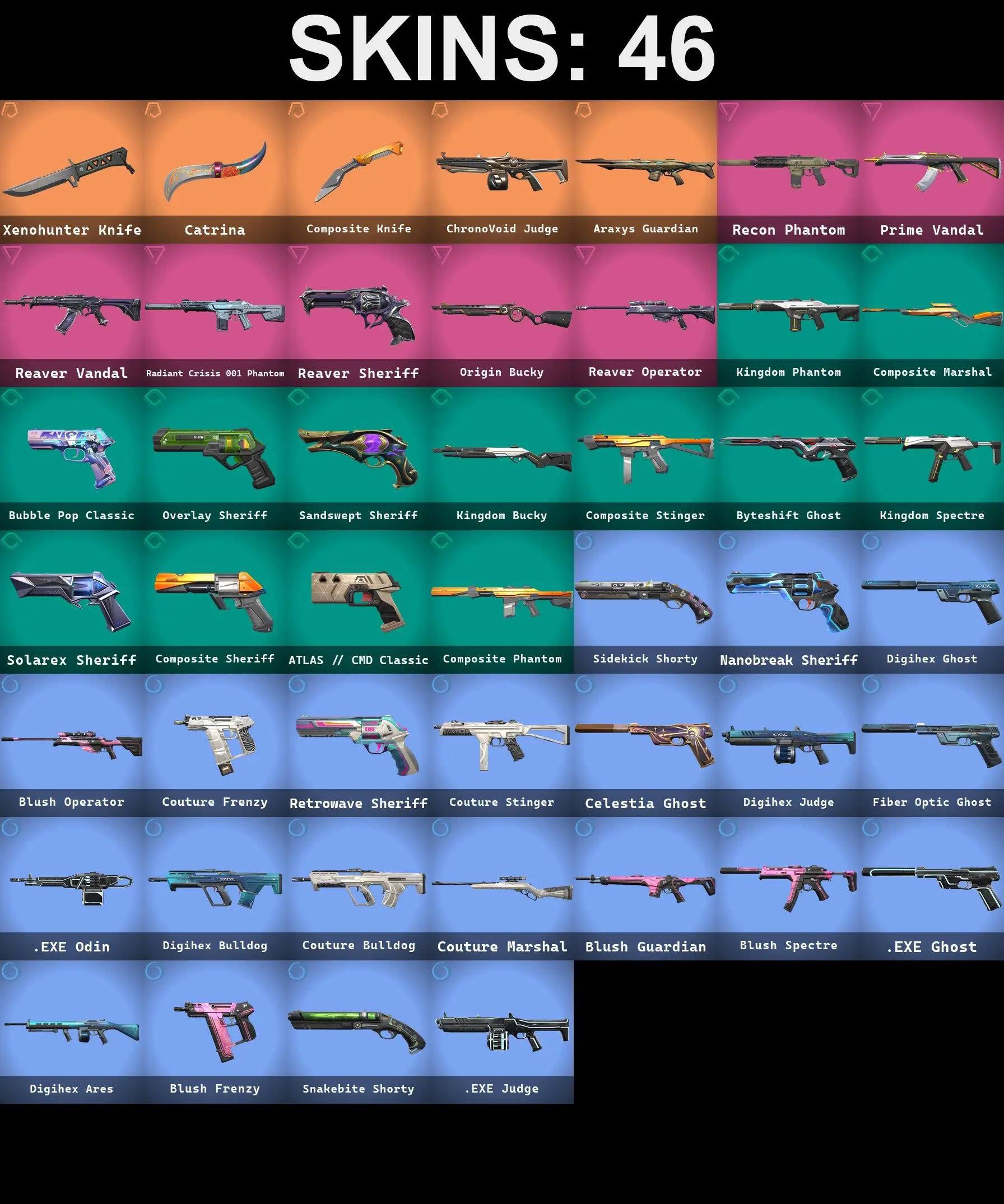 46 SKINS | 3 KNIFE | XENOHUNTER KNIFE | REAVER VANDAL | REAVER OPERATOR | REAVER SHERIFF | RADIANT CRISIS 001 PHANTOM | PRIME VANDAL | ORIGIN BUCKY | CHRONOVOID JUDGE | RECON PHANTOM | CATRINA | COMPOSITE KNIFE | ARAXYS GUARDIAN |