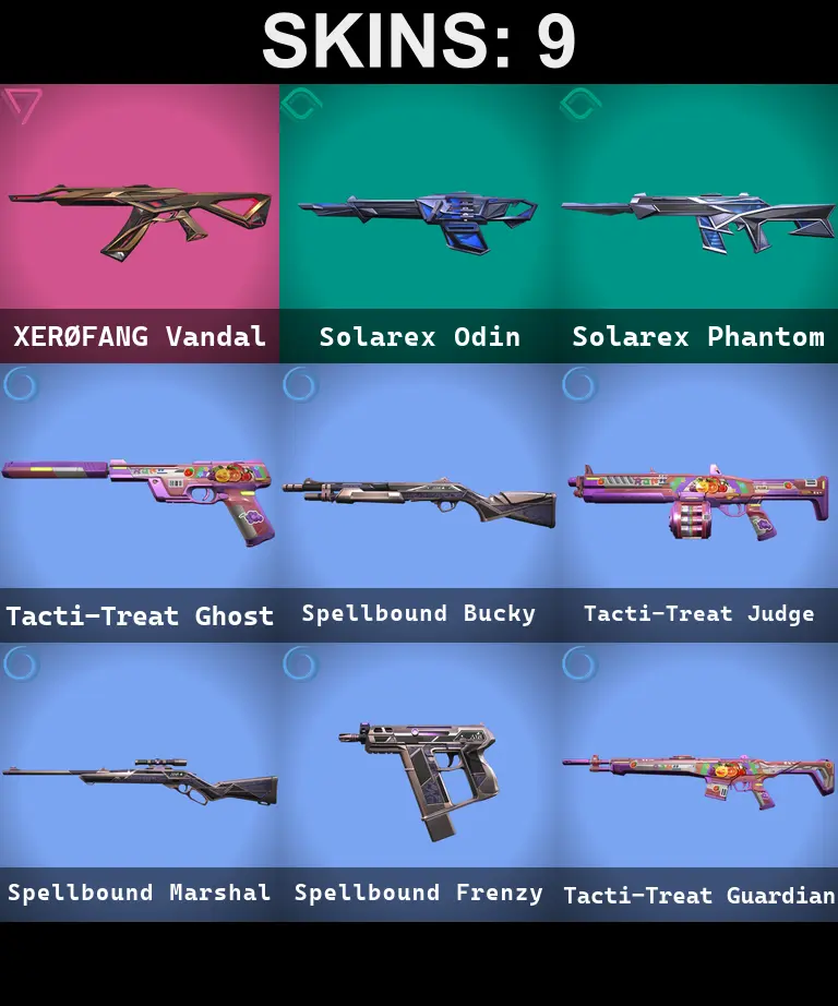 9 SKINS | XEROFANG VANDAL | SOLAREX ODIN | SOLAREX PHANTOM | TACTI-TREAT GHOST | SPELLBOUND BUCKY | TACTI-TREAT JUDGE | SPELLBOUND MARSHAL | SPELLBOUND FRENZY | TACTI-TREAT GUARDIAN | NA | UNRATED | 3 AGENTS | FULL ACCESS | SCREE