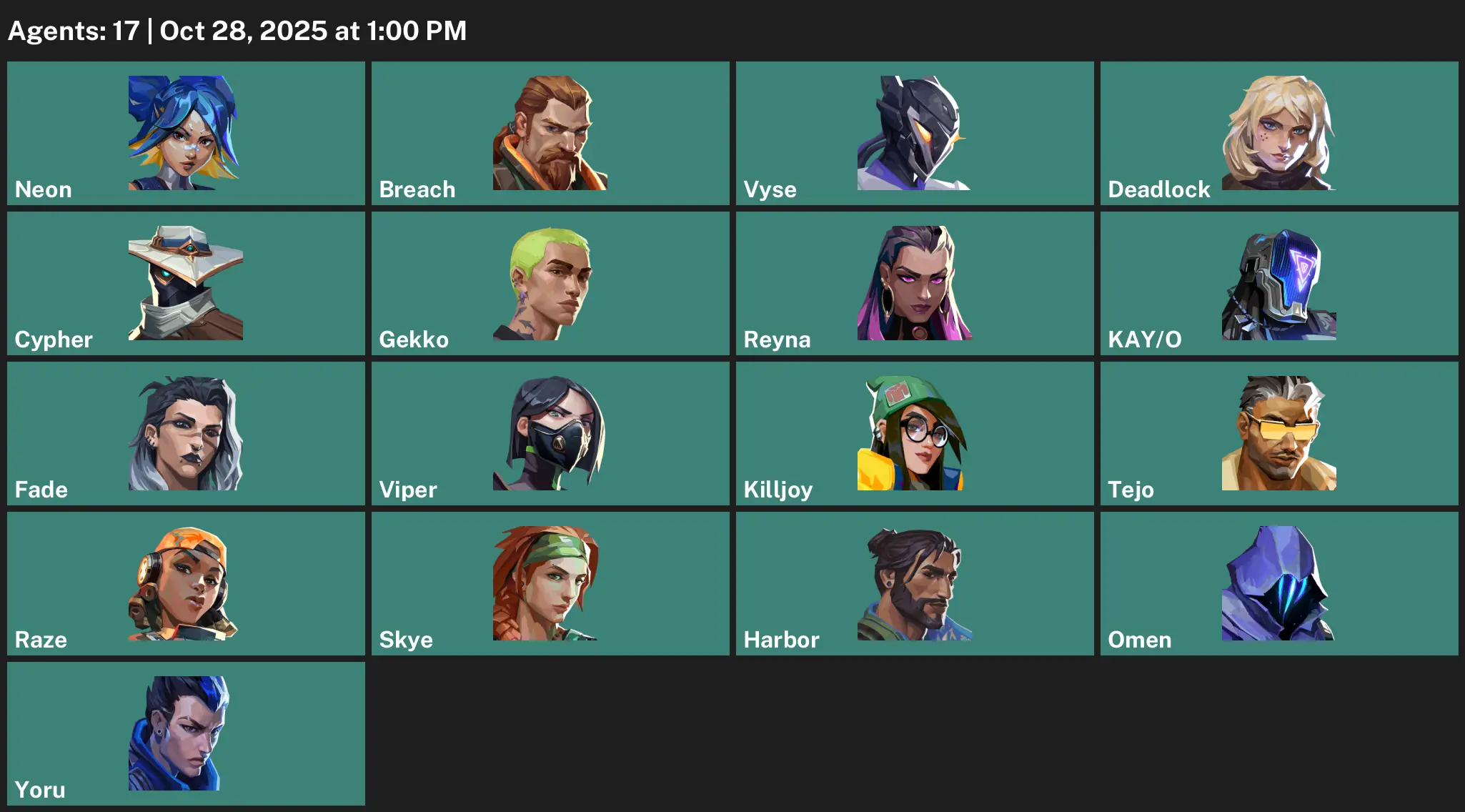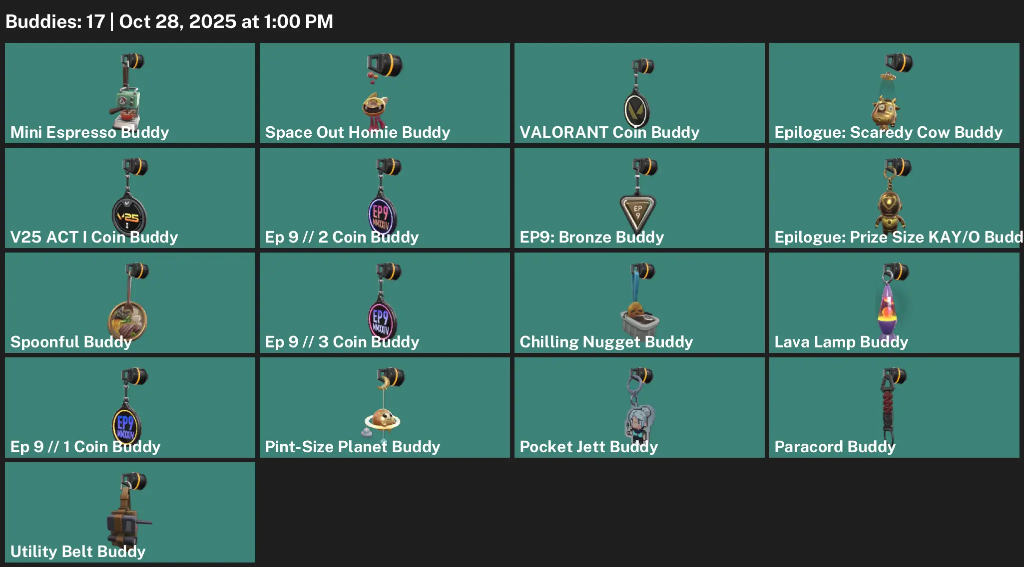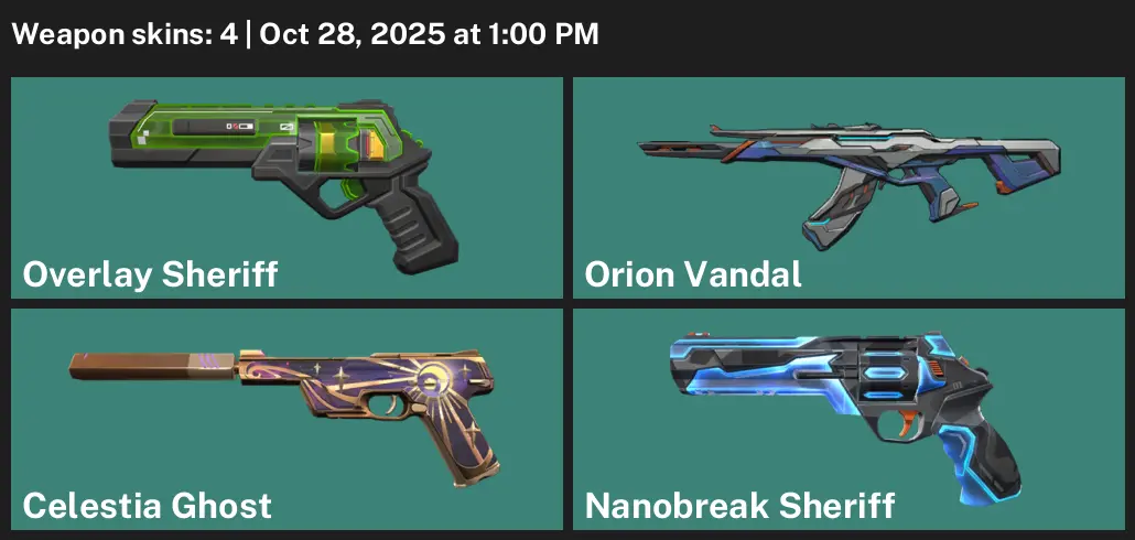 🪻 AP 🫁 Bronze 2 🏄 4 Skins 😮 209 VP 🎳 17 Agents 🖕 Value: 1275 VP 😪 Overlay Sheriff 🐰 Orion Vandal 🍆 Celestia Ghost 🏂 Nanobreak Sheriff