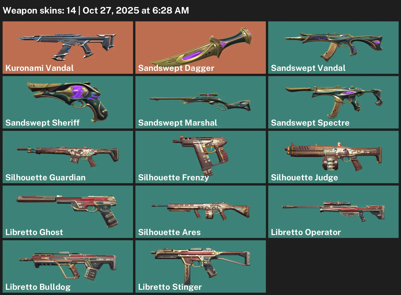 🛵 AP 🧗♂️ Unranked 🥃 14 Skins 🧘♀️ 75 VP 🌊 16 Agents 😨 Value: 2375 VP 🥶 Kuronami Vandal 🥬 Sandswept Dagger 🍅 Sandswept Vandal 👉 Sandswept Sheriff 🏝 Sandswept Marshal 🫦 Sandswept Spectre