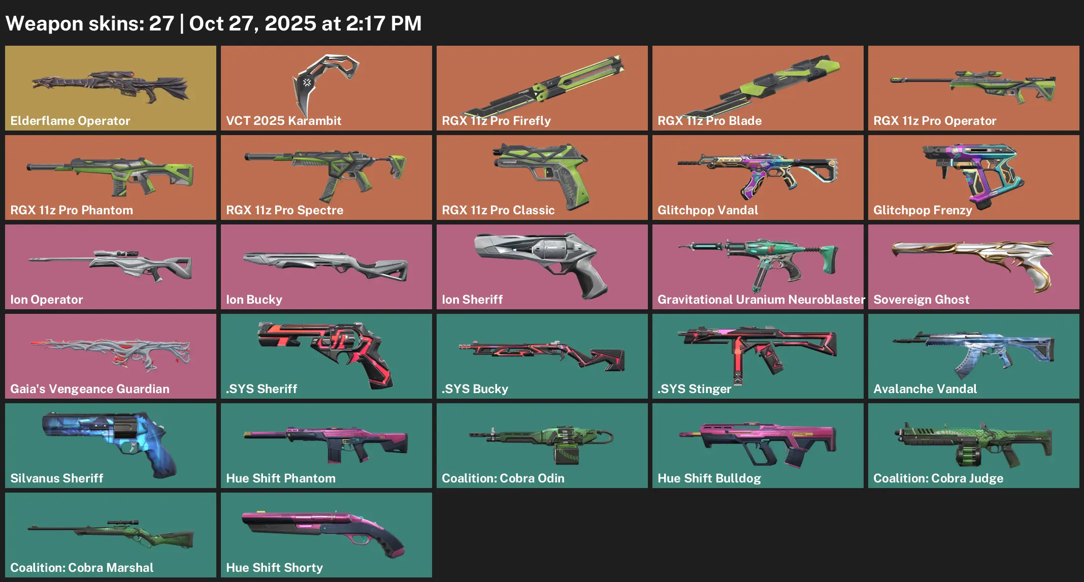 🧗♂️ AP 😈 Unranked 🤗 27 Skins 🥔 182 VP 🔋 5 Agents 😶🌫️ Value: 37425 VP 🐥 Elderflame Operator ⌛️ VCT 2025 Karambit 📅 RGX 11z Pro Firefly 📬 RGX 11z Pro Blade 🐱 RGX 11z Pro Operator 🌮 RGX 11z Pro Phantom