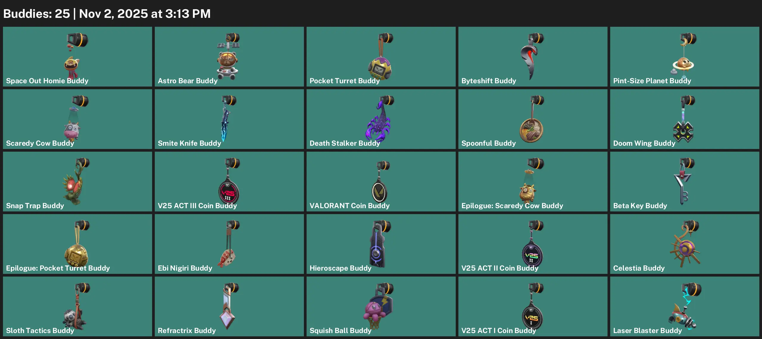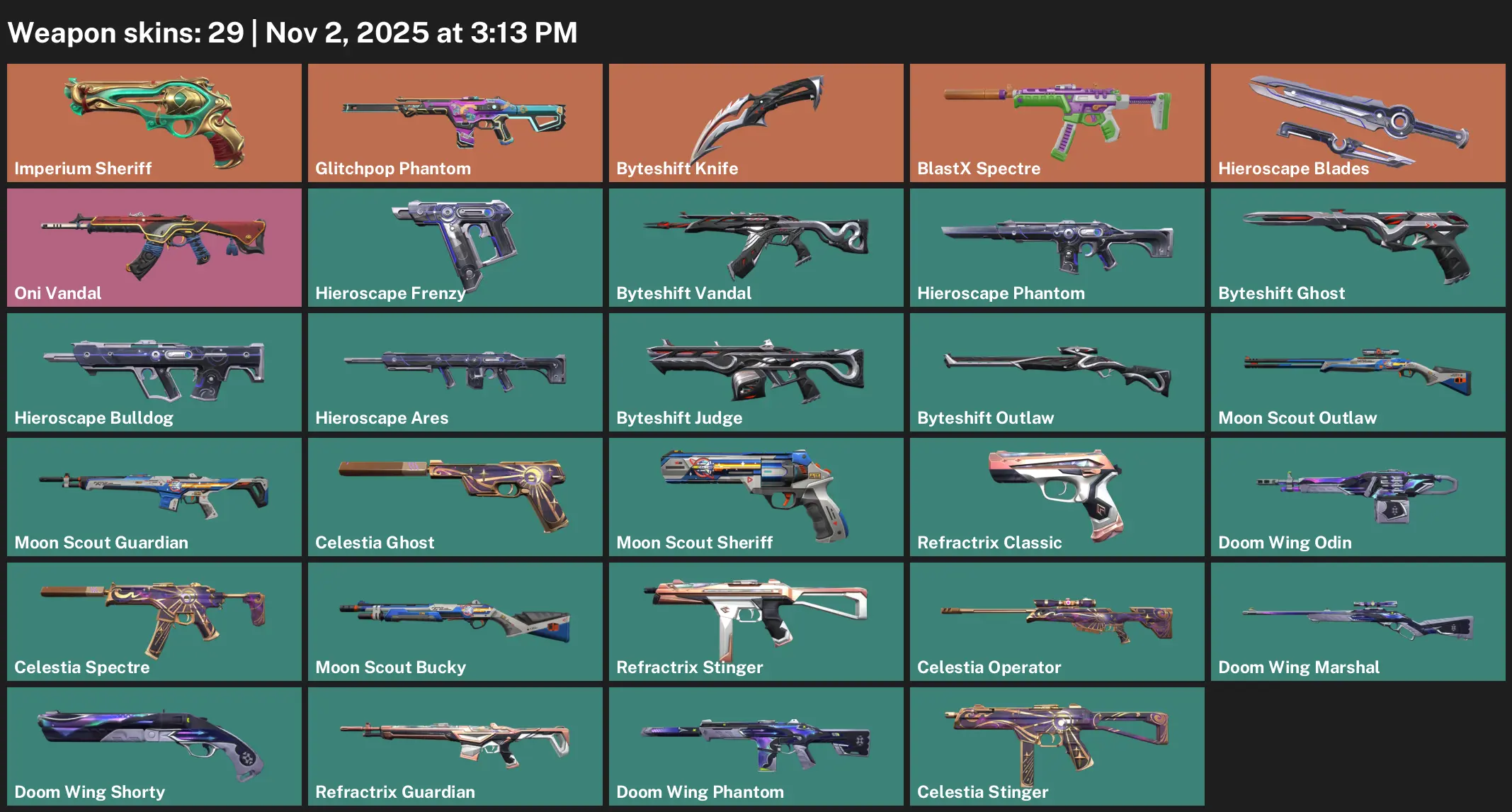 🪽 BR 🎼 Bronze 1 🦷 29 Skins 🚉 82 VP 🕋 14 Agents 🏆 Value: 8300 VP ⚰️ Imperium Sheriff 📫 Glitchpop Phantom 📫 Byteshift Knife 💡 BlastX Spectre 🎹 Hieroscape Blades 🥿 Oni Vandal