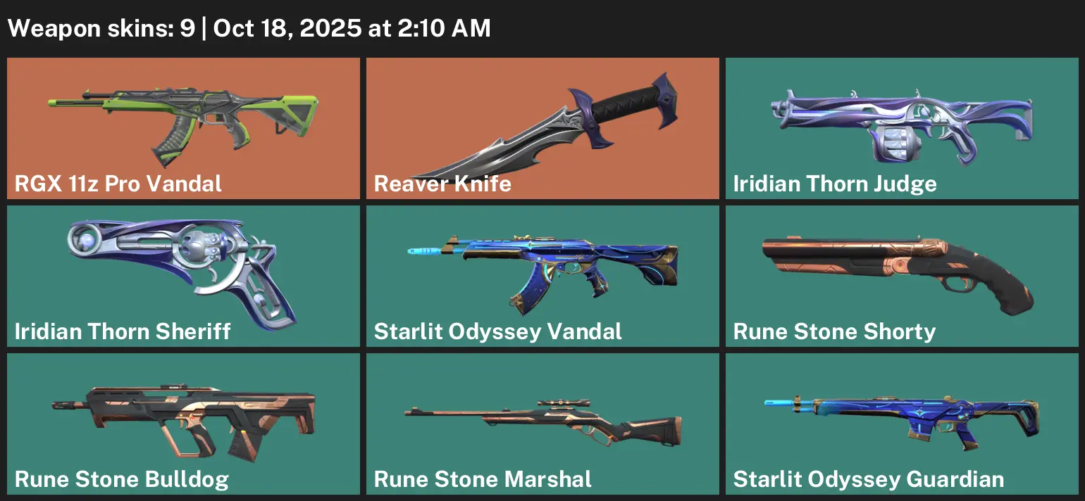 🫁 BR ☕️ Unranked ☔️ 9 Skins 🪐 451 VP 🚣♂️ 5 Agents 🐥 Value: 5725 VP 🐒 RGX 11z Pro Vandal 💶 Reaver Knife 🩸 Iridian Thorn Judge ☂️ Iridian Thorn Sheriff 🍣 Starlit Odyssey Vandal 🪐 Rune Stone Shorty