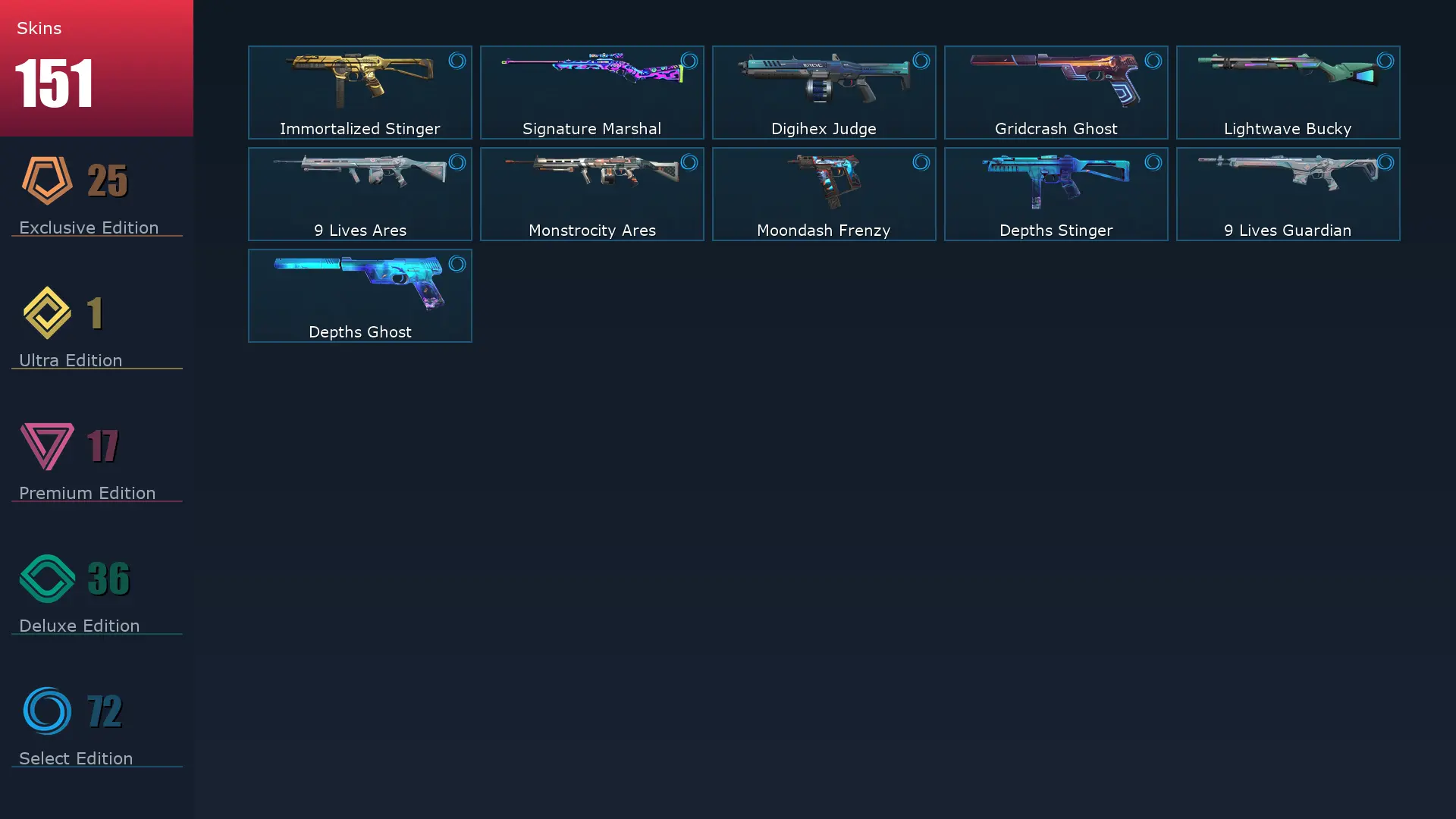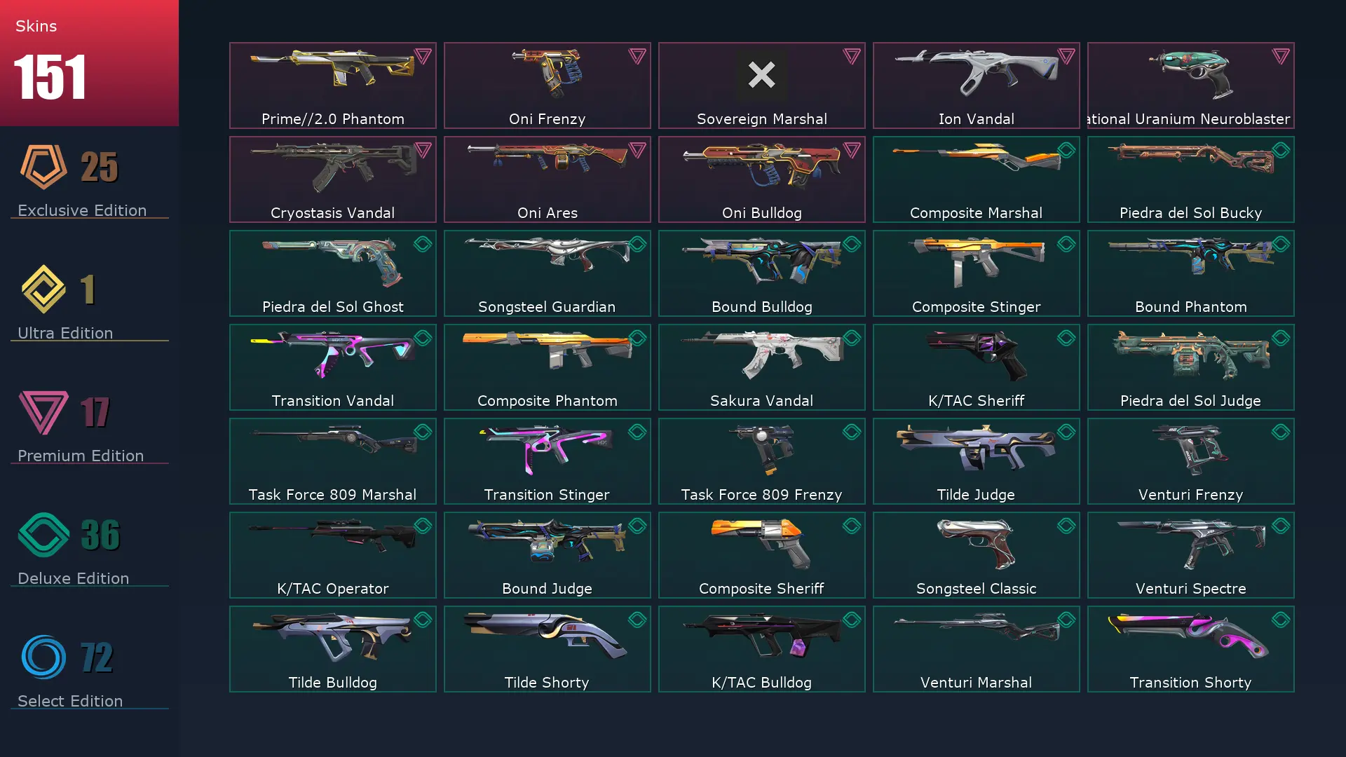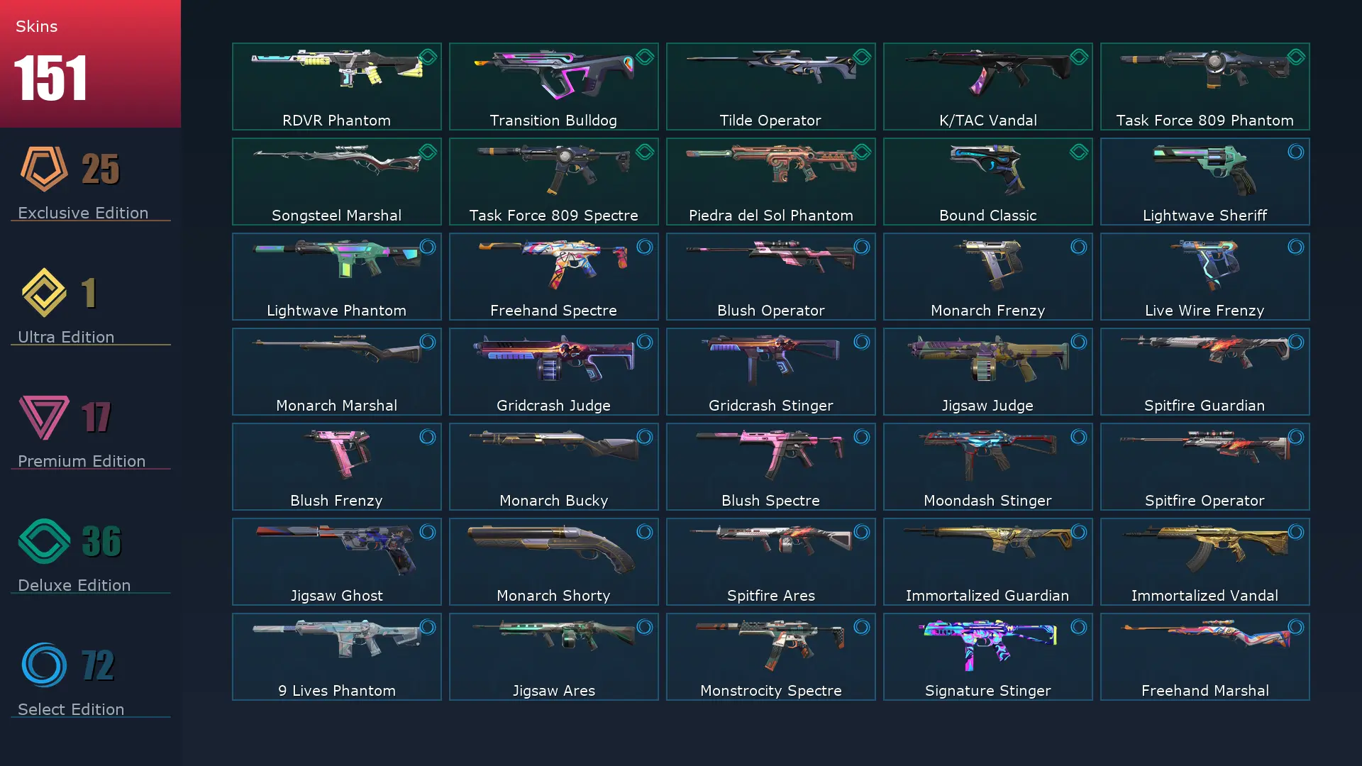 EU 🏤 151 Skins ✒️ 26 Agents 🪮 213 Level 🔪 VCT LOCK//IN Misericórdia 🚑 Champions 2022 Phantom 🏗 Champions 2023 Vandal 🏎 Champions 2022 Butterfly Knife 🤼♂️ Champions 2023 Kunai 🥻 Prelude to Chaos Vandal 🧘♀️ Oni Vandal
