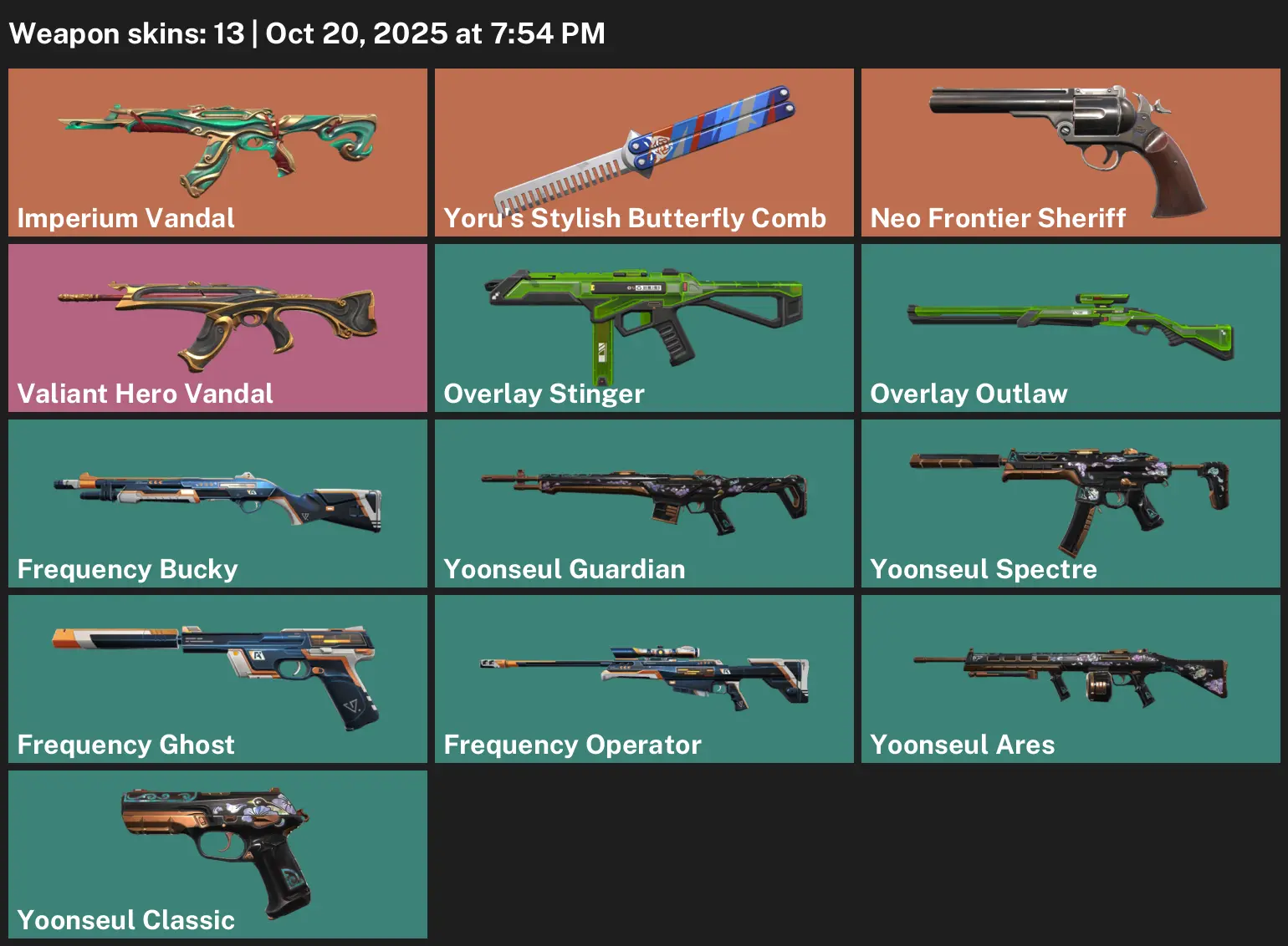 LA | 13 Skins | exp IRON 3 | Valiant Hero Vandal | Neo Frontier Sheriff | Imperium Vandal | Yoru's Stylish Butterfly Comb | Overlay Stinger | S4G