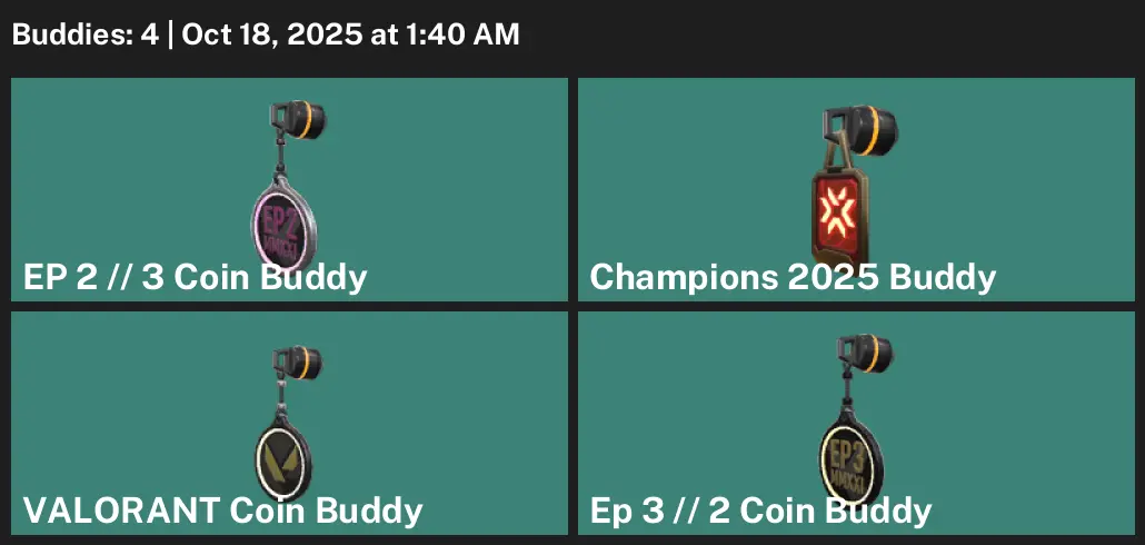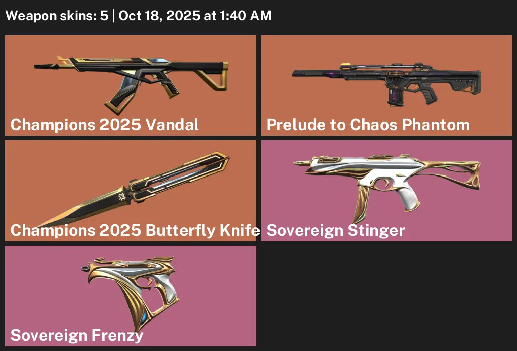 🗺 NA 🐶 Unranked 📡 5 Skins 😆 19 VP 🎭 2 Agents 🛣 Value: 13750 VP ⌛️ Champions 2025 Vandal 📅 Prelude to Chaos Phantom ⚓️ Champions 2025 Butterfly Knife 🪄 Sovereign Stinger 🧼 Sovereign Frenzy
