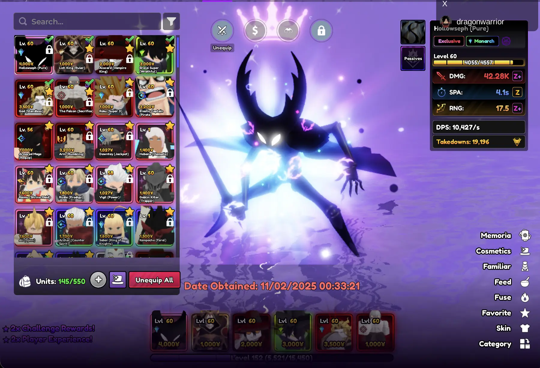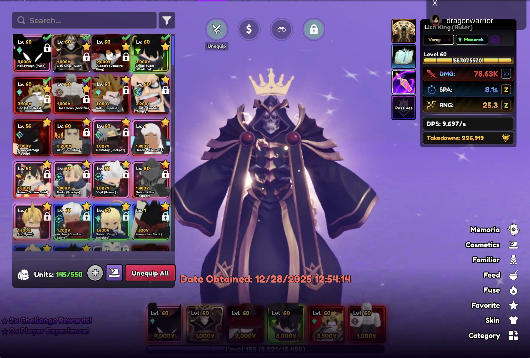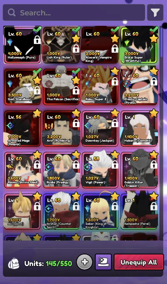 ✅ Instant 📊 Lvl 152 🤴 16 Monarch ⚡️ 21 Shiny ⭐ 145 Units 🌑 Hollowseph 💀 Lich King 🩸 Alocard 🥗 Brolzi Super ✨ God 🦅 The Falcon ⚡ Roku 👑【Anime Vanguards】