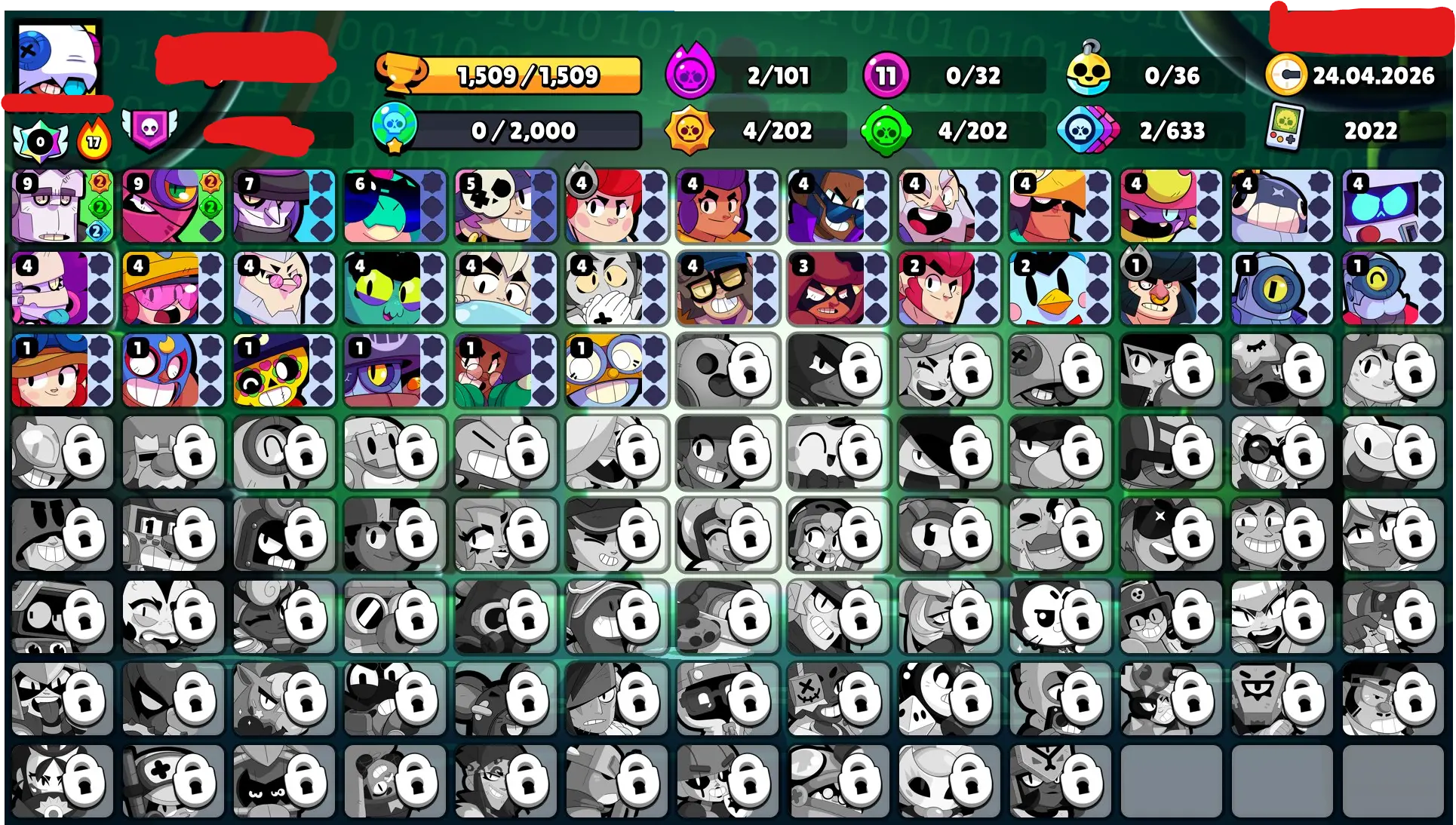 32 BRAWLERS ⭐️ 12 Skins ⭐️1509 Trophies