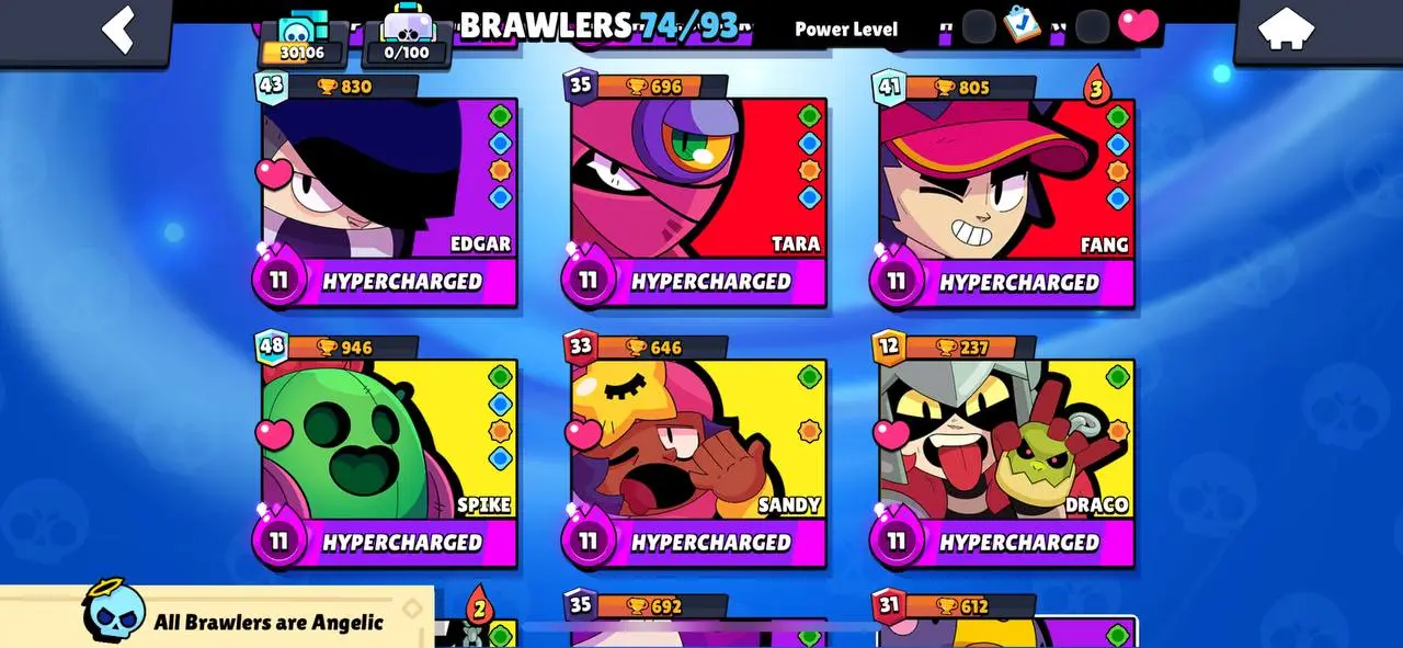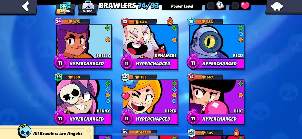 💥 BRAWL STAR ✨ 30K TROPHY ✨74 BRAWLS ✨ 13 HYPER ✨5 MAX ✨ 1K NEGETIVE GEMS[ ⸱ ] ✨ 132 SKINS TOTAL ✨ CHEAPEST IN MARKET ✨