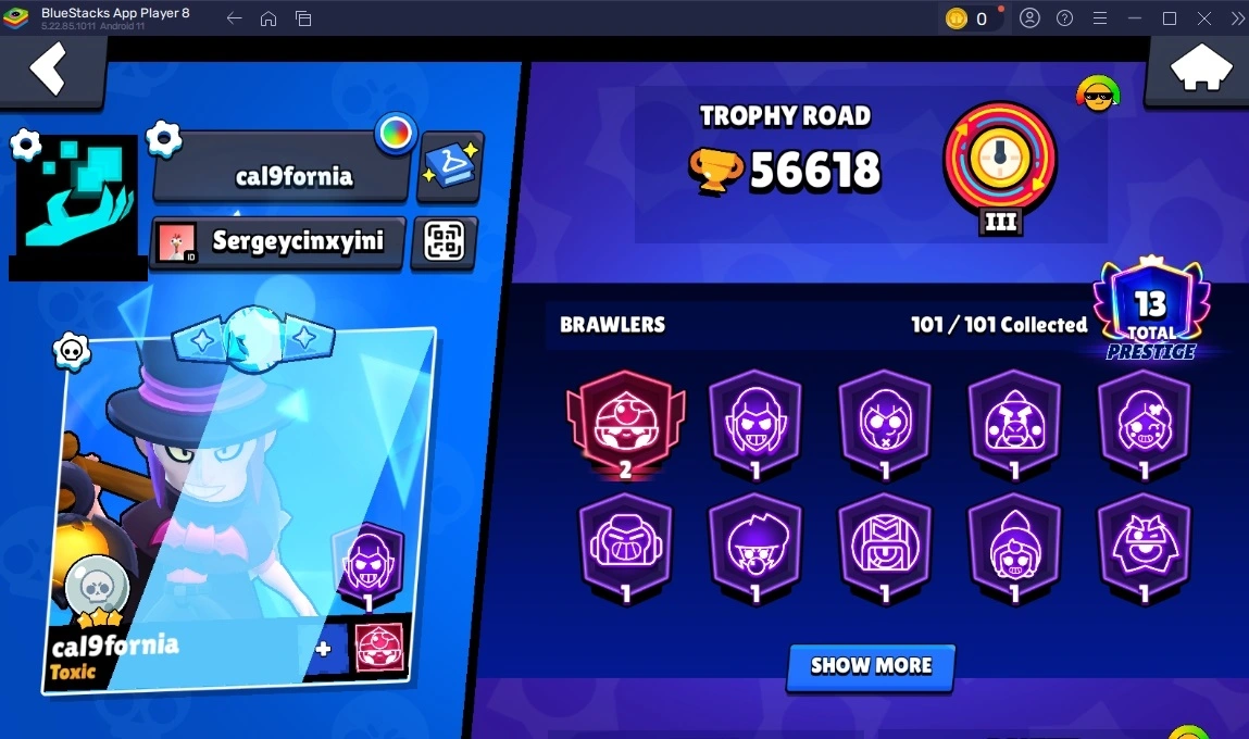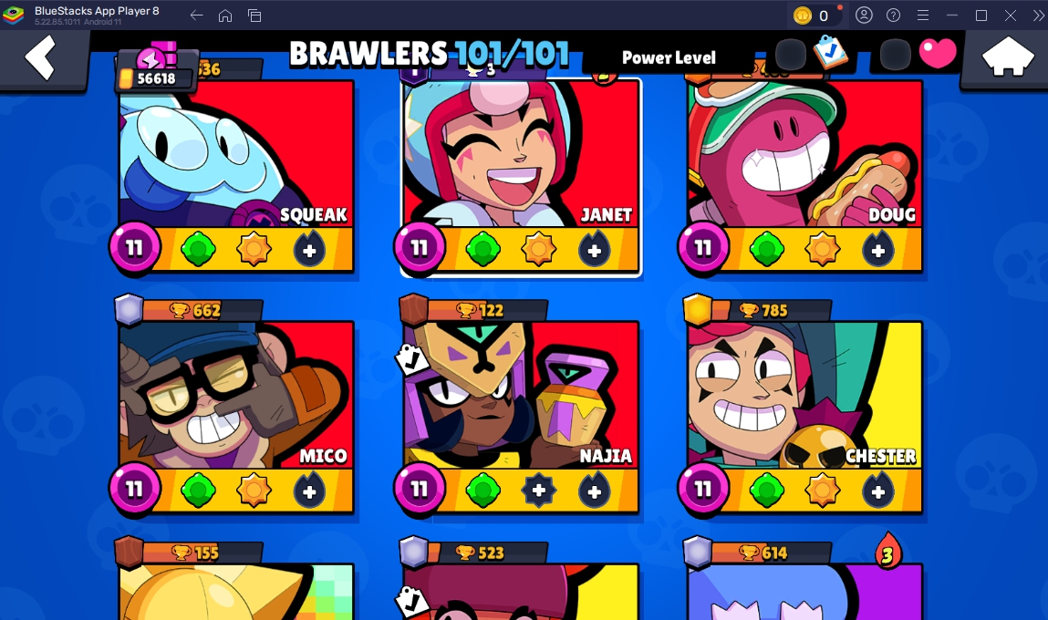 GENE 2 PRESTIGE ⭐ 214 SKINS ⭐ 56.600 TROPHY ⭐ 101 BRAWLERS ⭐ 21 HYPERCHARGED ⭐ 31 MAXED BRAWLERS ⭐ 13 PRESTIGE ⭐ 31 BUFFIES ⭐ VALKYRIE JANET ⭐ BANANAS COLT ⭐ CUPID PIPER ⭐ IMPIE COLETTE ⭐ FANGUARD ⭐ LEGENDARY ⭐ 50K