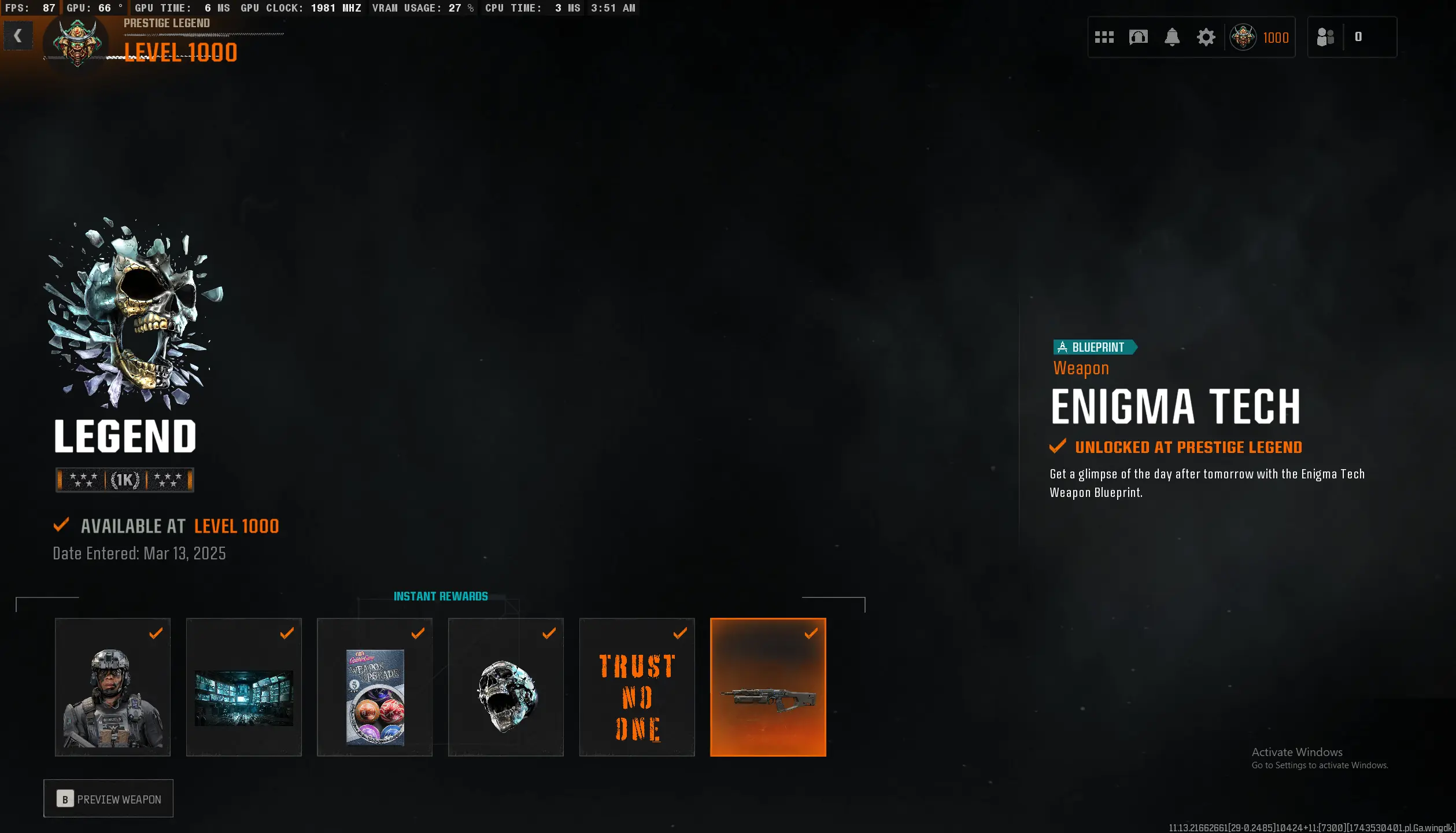 Prestige Legend Level 1000 🔥 Dark Matter x Nebula 💠 1200+ Camos Unlocked 🔫 All Guns Maxed 🎭 Samuels Skin 💥 All Augments Max 🎖️ 105 Calling Cards 🧍 19 Operators 🔗 Linkable: Steam / Battle.net / PSN / Xbox 🎮 BO6 & WZ4