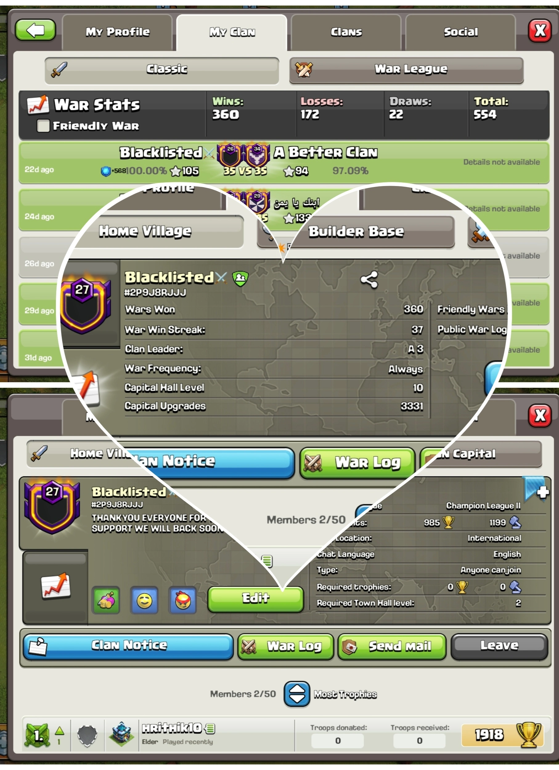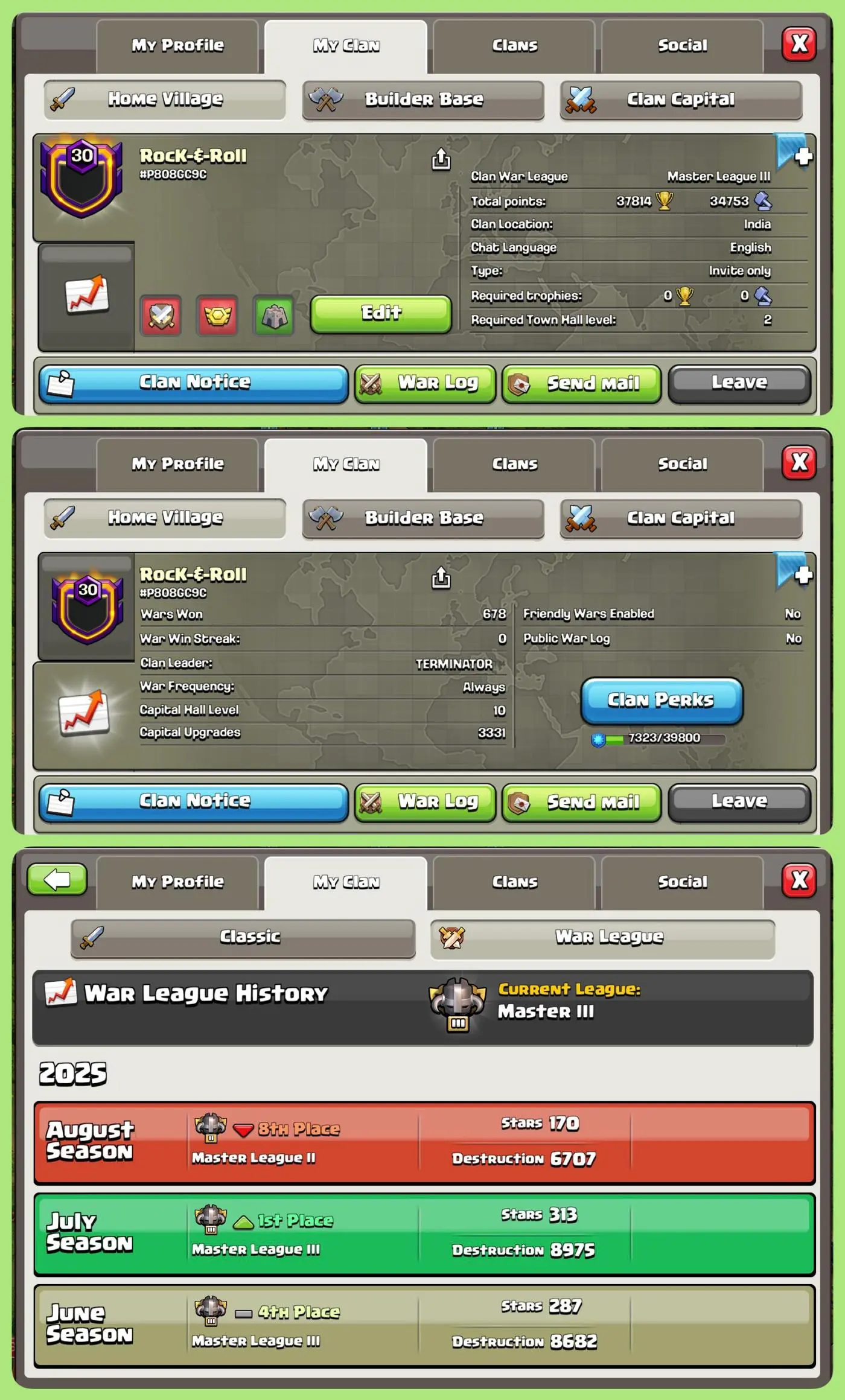 CLAN LEVEL 20//NAME KING OF CLAN//MASTER 1 LEADGE //CLAN CAPITAL 10 FULL MAX//WAR WIN 335/322