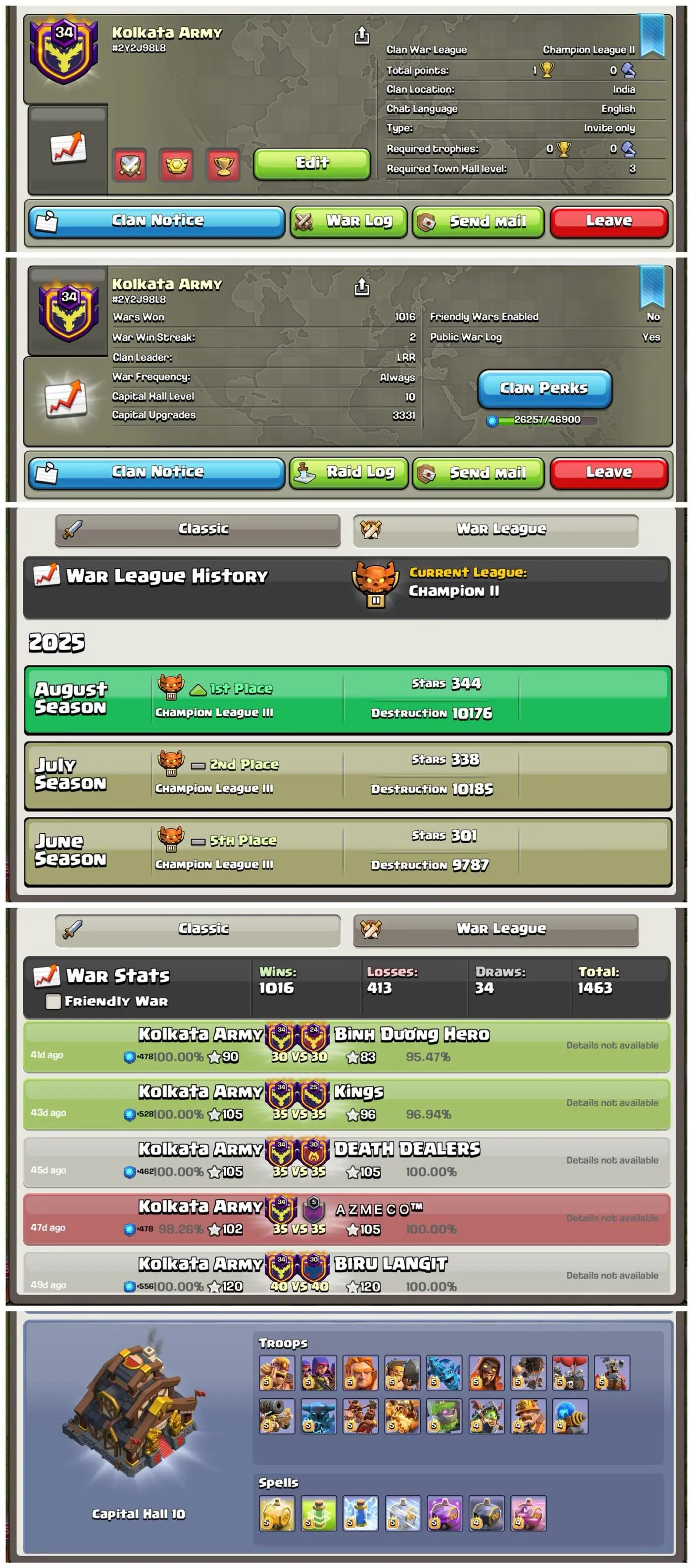 1016 WAR WINS 🔥 LEVEL 34 NEAR TO LEVEL 35 SOLID CLAN EXTERME RARE HIGH CLAN IN MARKET🔥 || Champion League 2 || 100% Maxed Clan capital || & 413 Looses || Name - Kolkata Army 🪖