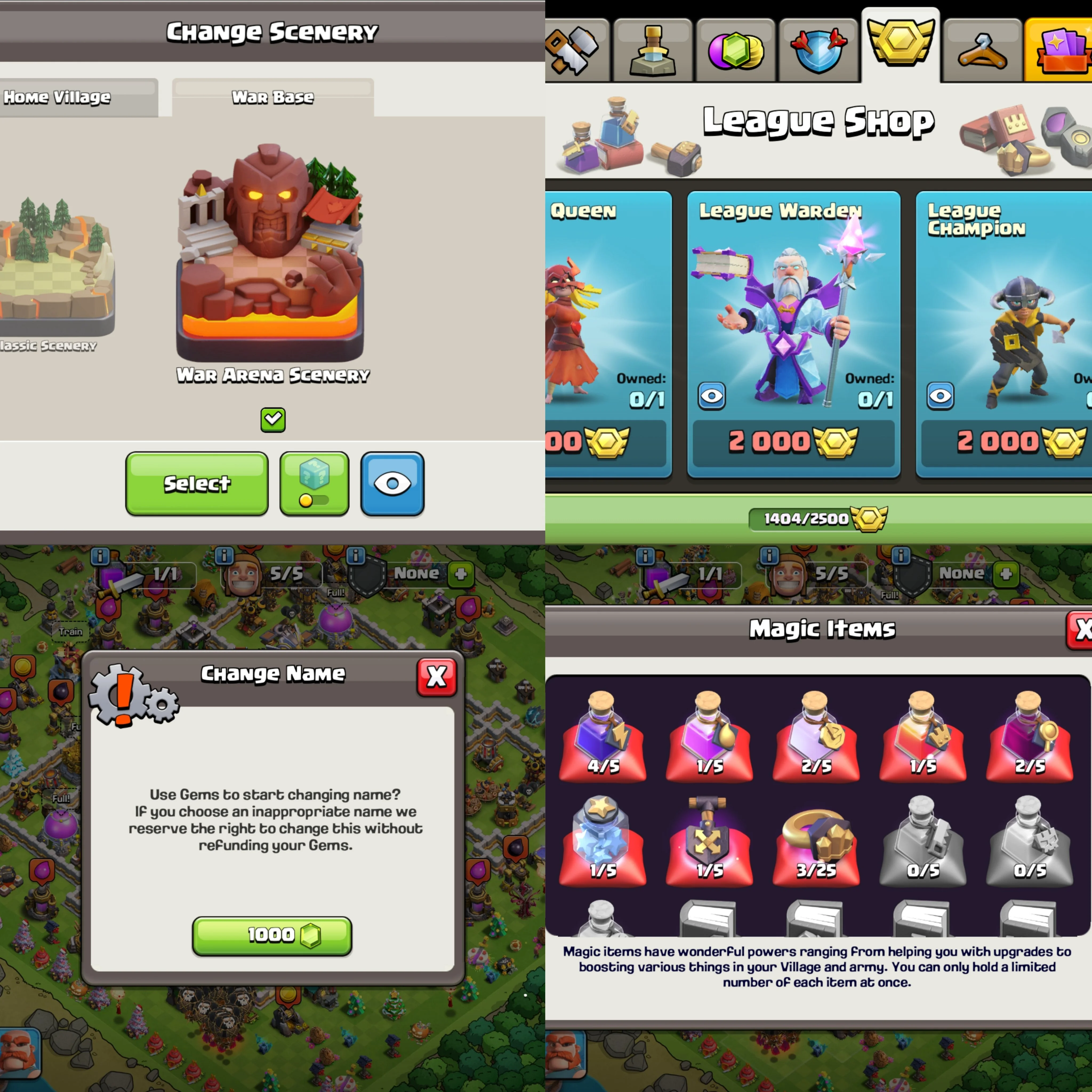 100% MAX EPIC EQUIPMENTS✨WAR ARENA SCENERY✨STACKED TH11 MAX✨GEMS-8724✨CWL-1404✨NO UPGRADE LEFT✨HERO:50-50-30-20✨XP-128✨1225 WS✨6X SKINS✨NC AVAILABLE✨FULL ACCESS
