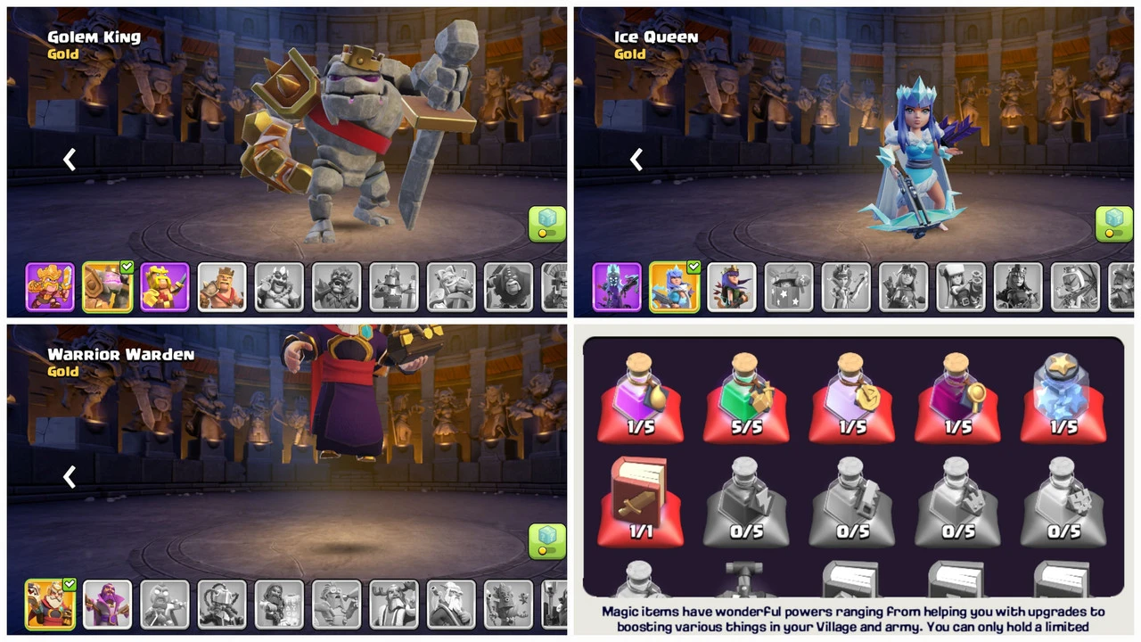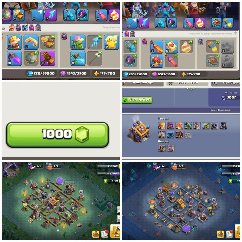 TH 13 Near Max 🧱 Level 160 🥇 Heroes 61_64_49_20 🪵 Gems 1100 🪜 6 Skins 🧍♂️ 4 Epic equipment 🆔 Nc 1000 Gems (Android &iOS) 🥉 M1835