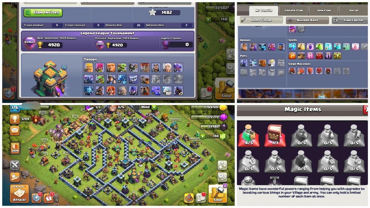 TH 14 SEMI MAX 💣 Level 176 🪶 Heroes 60_73_41_20 🧠 Gems 140 🏠 5 Worker 🔩 4 Skins 🌟 2 Epic equipment (Android &iOS) 🦸♂️ M1859