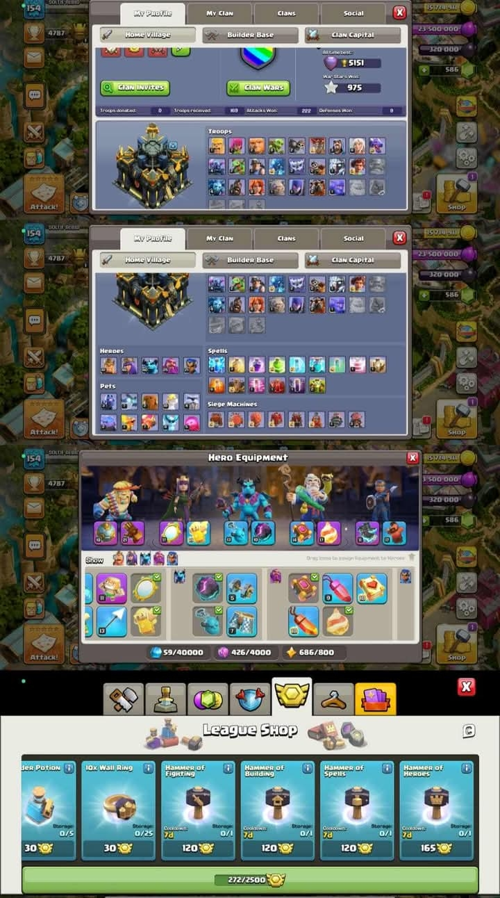 TH 17 MAX ➠MILITARY SCENERY ➠ SIGE MASINE SPELL TROPOS MAX➠GG (21) MM (17) FB (17) RB (11) SB (10) ➠CWL 272 ➠ NC YESS ➠XP 154 ➠HEROS: 41/48/40/25/21 ➠DRAK WALL BUYER MAIL