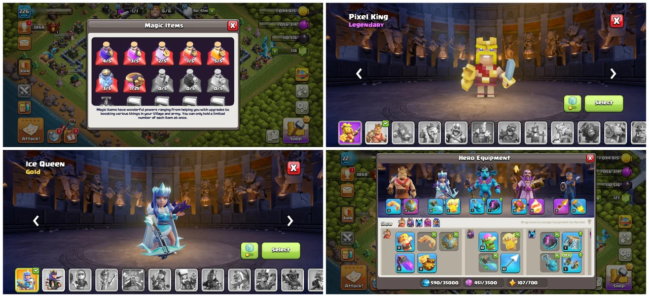 TH14 Semi Max 🧱 Level 226 🧤 Heroes 60_69_44_36_25 🦸♂️ 2 Skins 💯 3 Epic equipment 🪄 Nc 1000 Gems (Android & iOS) 🏯 M3654