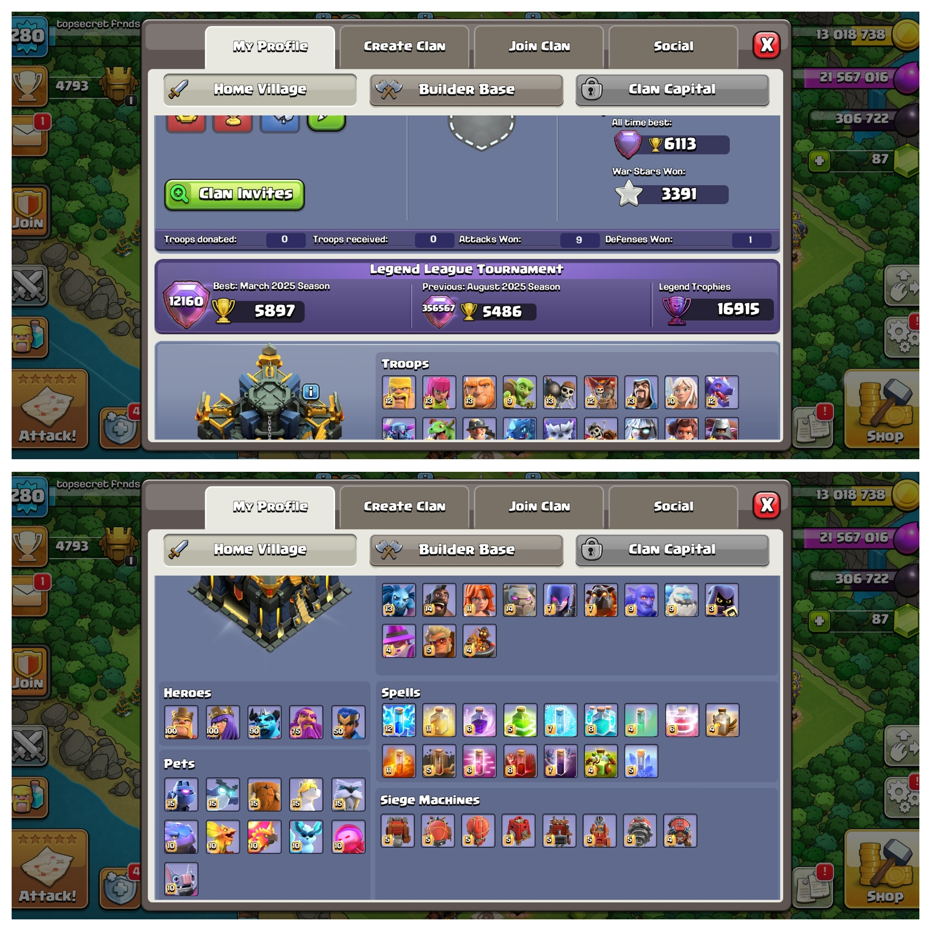 TH17 BOTH VILLAGE FULL MAX-26x EQUIPMENT MAX -24x HERO SKIN-6113 BEST-16900 LEGEND TROPHY-HIGH XP280-1256 MADEL-FULL ACCESS