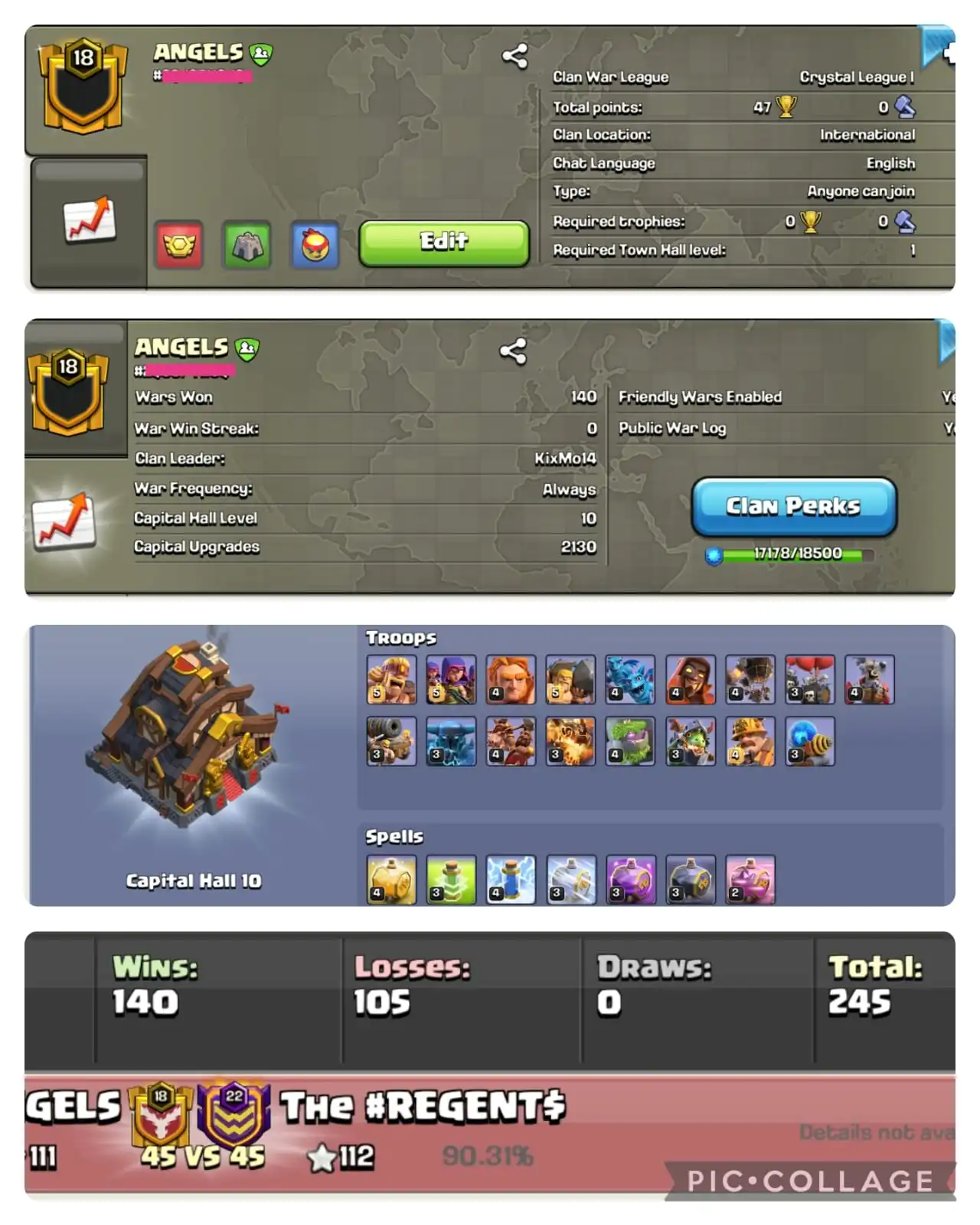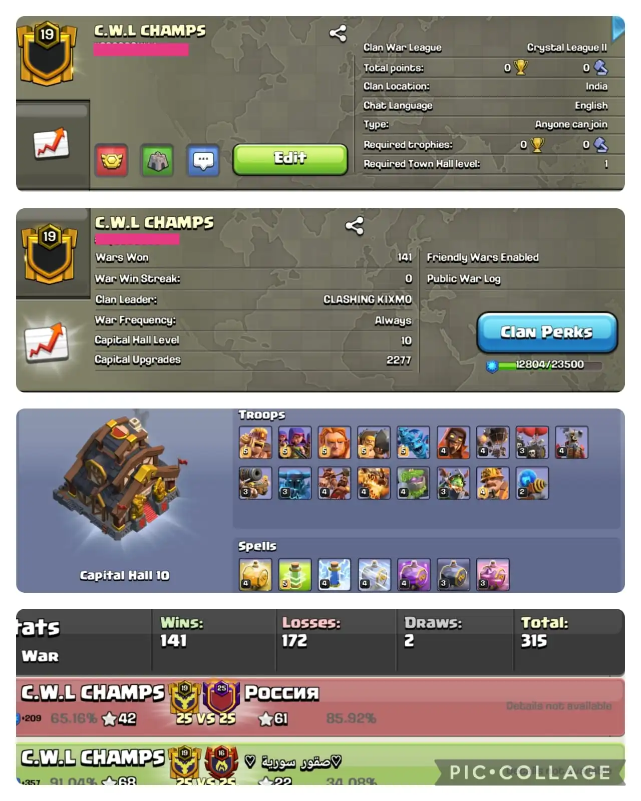 🔥 [CRYSTAL 2 ] 🏆NAME : C.W.L CHAMPS 🥶 LEVEL : 19 ⛈️ WARLOG W-L-D : 141-172-2
