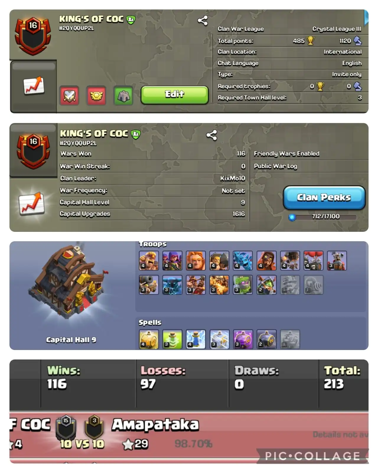🤑[CRYSTAL 3+CC 9] 🙂↕️NAME : KINGS OF COC 💥LEVEL : 16 😈 WARLOG W-L-D : 116-97-0 ⚡️