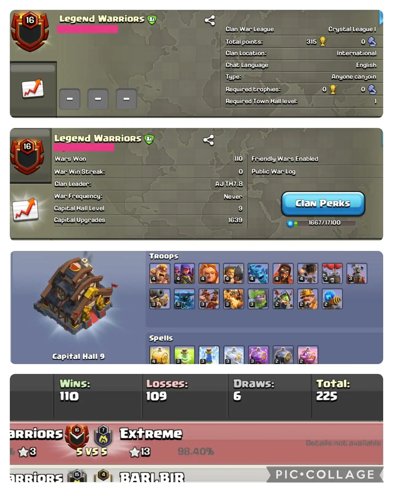 🔥 [CRYSTAL 1 ] 🏆NAME : LEGEND WARRIORS 🥶 LEVEL : 16 ⛈️ WARLOG W-L-D : 110-109-7 💀