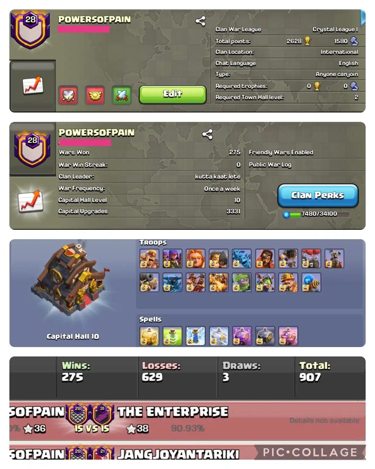 🔥 [CRYSTAL 1 ] 🏆NAME : POWERSOFPAIN 🥶 LEVEL : 28.2 ⛈️ WARLOG W-L-D : 275-629-3 💀