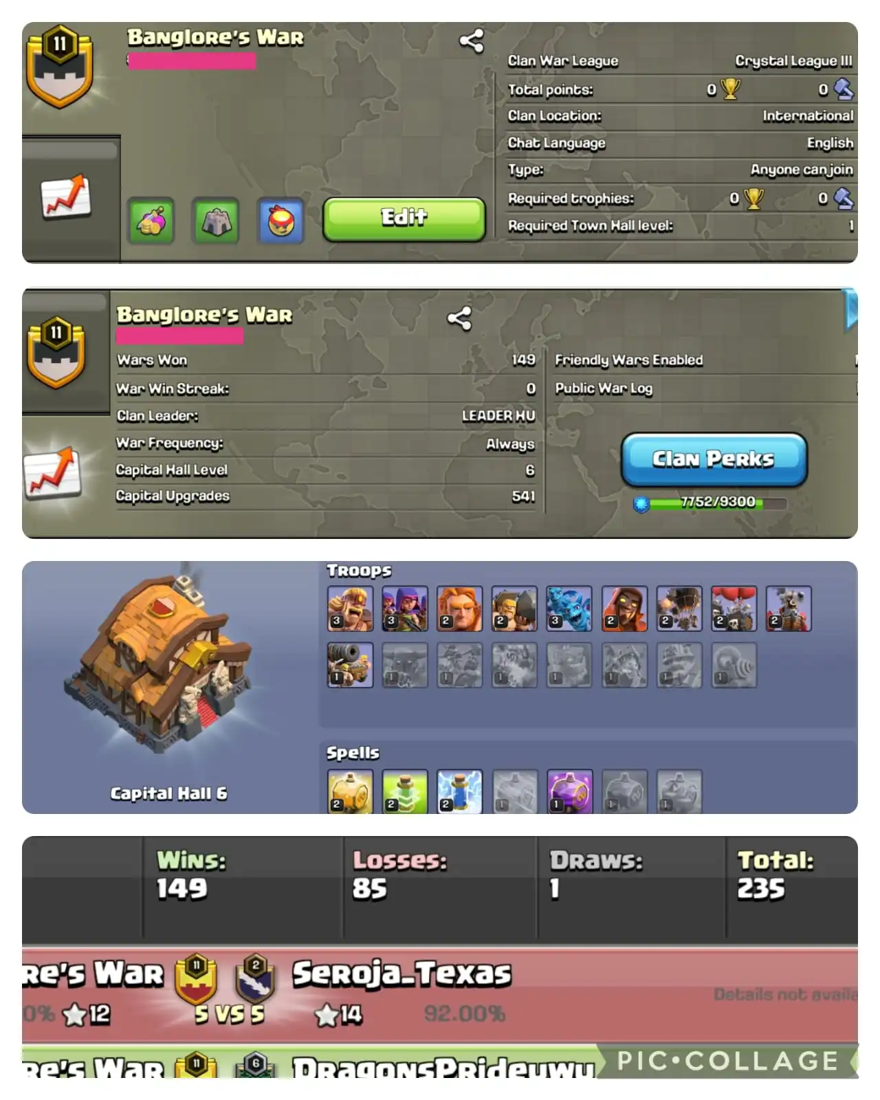 🔥 [CRYSTAL 3 ] 🏆NAME : BANGLORES WAR 🥶 LEVEL : 11.8 ⛈️ WARLOG W-L-D : 149-85-1 ⚡️