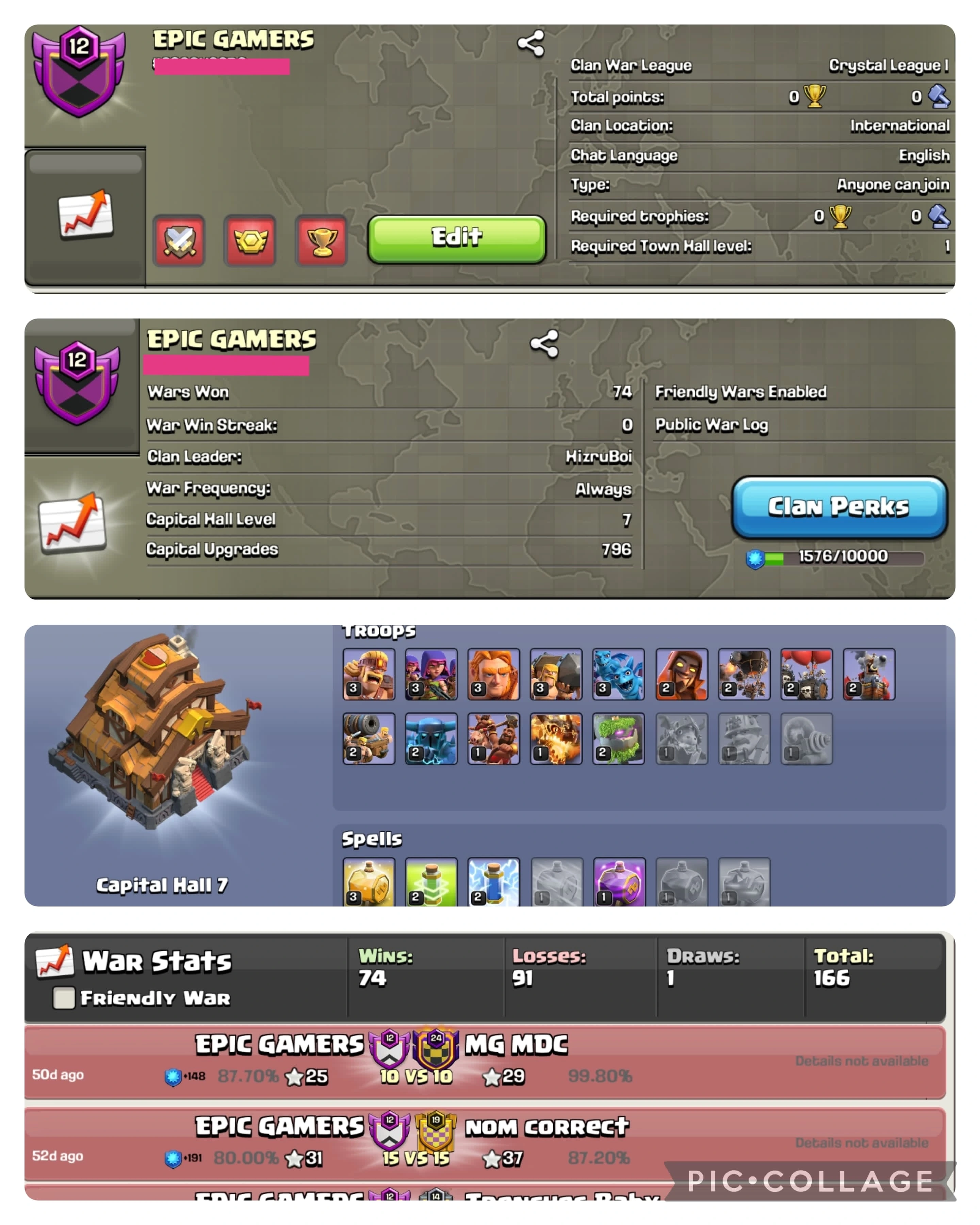 🥶[CRYSTAL 1 + CC 7 ] 🥰EPIC GAMERS 😎 LEVEL 12 😝 WARLOG W-L-D : 74-91-1 ⚡️