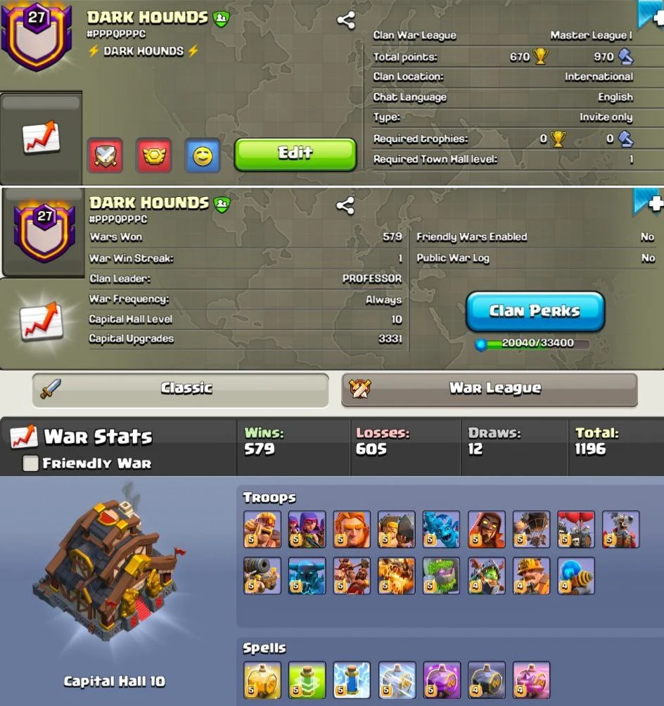 💥CRAZY PRICE💥 ❤🔥OP 13 LEVEL ENGLISH CLAN ⚡ NICE NAME : DARE TO TOUCH 💧 LEAGUE : GOLD 2 🔻 CLAN CAPITAL : 5 💢 WINS : 132 | LOSS : 175 🌲 BEST CLAN BUY NOW 🧣 FAST DELIVERY🚚