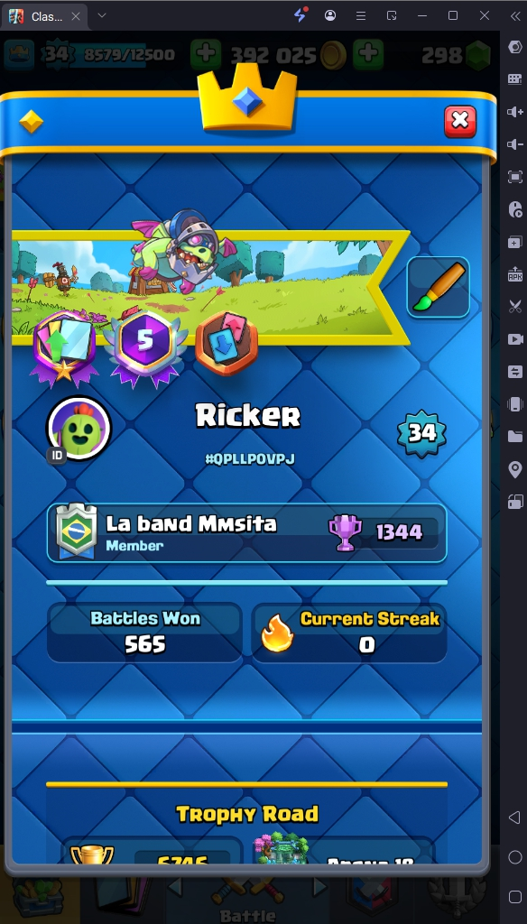 6746 TROPHY 🏆 34 LVL 💯 KT 12 👑 113 CARDS ♦️ 1 MAX CARDS 👑 0 ELITE CARDS 🔮 1 EVO 💯 EMOTE 20 🎭 #QPLLP0VPJ ⸱ TAG ACCOUNT ♥️